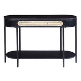 The Colson sofa table adds a nature-inspired accent to any home and features excellent craftsmanship and attention to detail. Its curved silhouette and mixed materials give this piece a cozy modern look and breezy aesthetic. The rattan insert mixed with the black finish is stylish. The Colson sofa table is a creative play on texture, tone, and style.