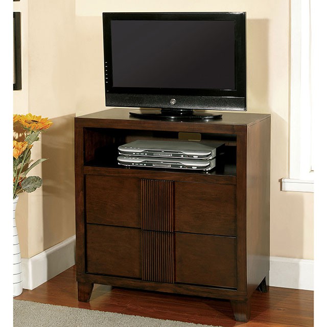 Contemporary styling with reeded accents and an espresso finish, this media chest can enhance a plain and simple bedroom. Unique vertical latches replace knobs and pulls, a part of its classy design.