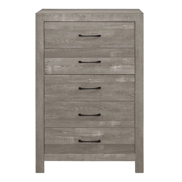 The style of the corbin collection is created by combining contemporary lines and rustic design in equal parts. the appearance of real wood is achieved by using a gray finish, which highlights the roughness of the 3d-printed paper veneer. the chest's drawer fronts have black metal hardware, which provides a complimentary contrast to the rest of the piece. the profile of the dresser is defined by a subtle framing, which further contributes to the unrestricted design of the collection.