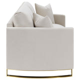 Opulent materials provide optimal comfort in this lush loveseat. It's crafted with kiln-dried solid pine wood, chenille, and foam and features accent pillows for added style and comfort. Reversible cushioned feather down blend seat backs offer soothing comfort after a long day. Elegant beige fabric upholstery stands out even more against the sturdy stainless steel legs with lustrous rose brass accents. You'll love the style and cozy comfort of this elegant loveseat in your living room or den.