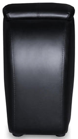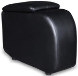 Dress up a home theater room with this sleek black console. Great for nestling between chairs, this console was designed with comfort in mind. Add extra space between recliners with the smooth front and the rounded top. Deep tones offer a clean feel to the modern silhouette. Build a set of side by side recliners for family movie night or to fill any size theater room.