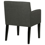 Enhance your casual dining room with these stylish mid-century-inspired dining chairs. Featuring cushioned arms wrapped in durable charcoal grey fabric, they offer both comfort and style. The sleek design and versatile color effortlessly complement any dining space, creating a cozy and inviting atmosphere. Elevate your dining experience with these chic and comfortable chairs.