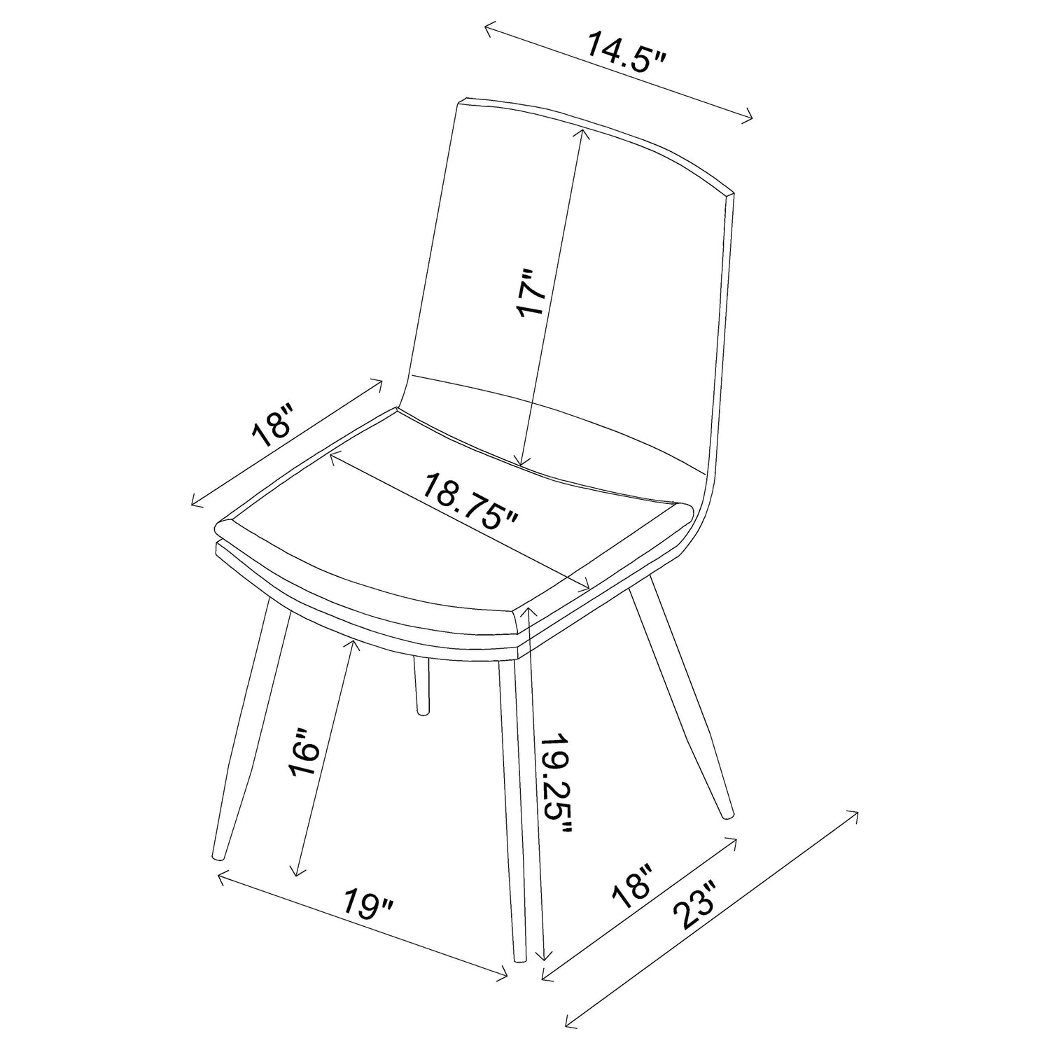 Simplified structure lends timeless personality to a set of two dining side chairs. Perfect for a relaxing and inviting breakfast nook or dining table, the chair feature warm coffee faux leather upholstery, with a padded seat for extra comfort. The armless seat is gently rounded to create exceptional support and comfort for everything from your morning coffee to a lingering meal shared with family and friends. The base of each chair features tapered, flared legs, crafted in metal with a black finish for a crisp look and feel at any table. The earthy look of faux leather is a charming complement to both wood and stone dining tables, making this a versatile choice that blends seamlessly with existing decor.