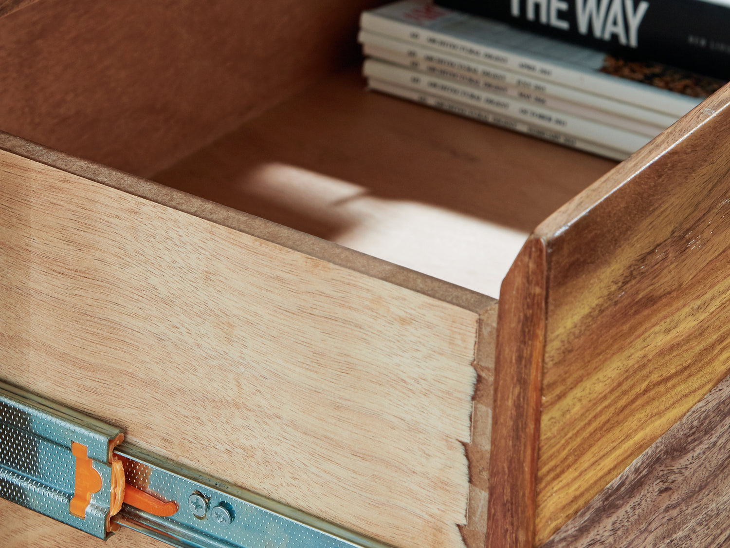 Series Features: Urban contemporary design. Made with Shesham wood, veneer and MDF substrate. Finished in a clear natural wood tone to enhance the rich natural beauty of the wood. Cases feature clean-lined design with thick beveled edge front frames and hardware less drawer fronts. Drawers have fully finished interiors, English dovetail construction and heavy duty ball-bearing side glides for durability and smooth function. The low profile bed features a matching beveled frame headboard panel. Nightstand includes a 110V power supply with USB-A and USB-C charging ports.