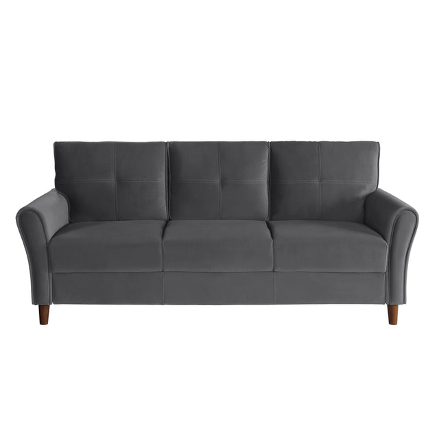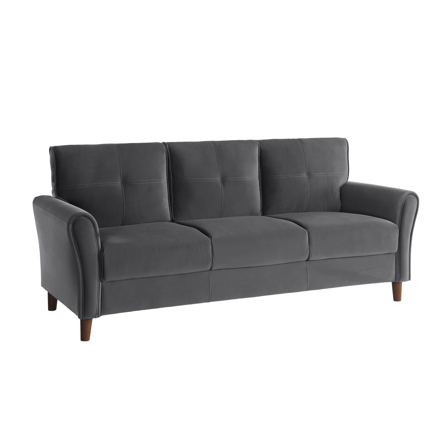 The sofa from the dunleith collection adds both a daring statement and a gentle touch to the design of your living room thanks to its tailored appearance, which is accomplished by flared arms, clean lines, and a cover made of gray velvet. the velvety seatbacks of the seating group have a contemporary profile and are fronted with stich-tufting, each design detail contributing to your utmost comfort.