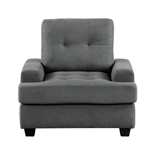 With the dunstan collection, the practicality of being able to arrange your preferred seating group in accordance with the dimensions of the room at your disposal is a fact. the chair has a transitional design that works well in a variety of different decorative settings. the stylish versatility of the chair will compliment the atmosphere of your room. the dunstan collection features upholstered pieces that are wrapped in a dark gray fabric, making them the ideal canvas for the decorative motif of your house.