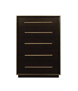 With five spacious drawers, this chest is convenient and versatile. Its large size is ideal for keeping your wardrobe organized. Its strong silhouette is enhanced by an attractive, smoked peppercorn finish. Its long, sleek drawer handles and outer frame are a lovely shade of gold, giving it an eye-catching touch of glamour. With a transitional design, this chest blends seamlessly with a variety of decor styles.