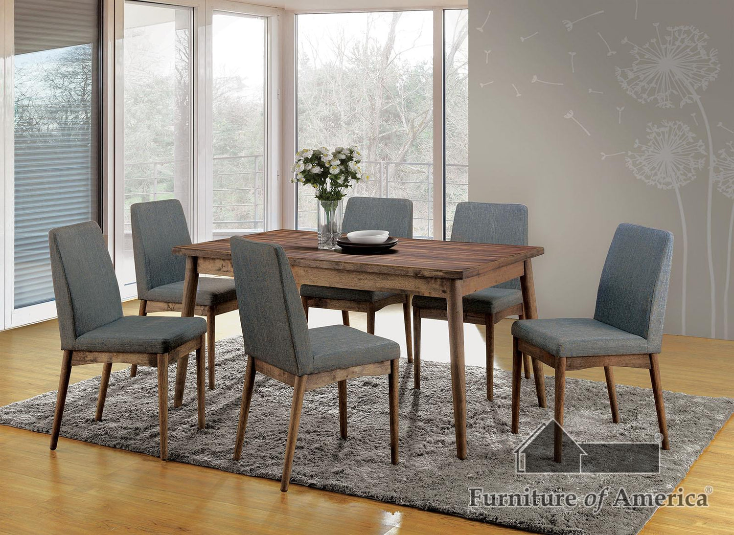 Make your family meals great by adding this mid-century design to sweeten the experience! Slim, tapered wood legs support the plank style table top, offering both a chic appearance and quality support. The matching side chairs feature padded fabric upholstery to provide an extra incentive to gather around for a great family dinner.