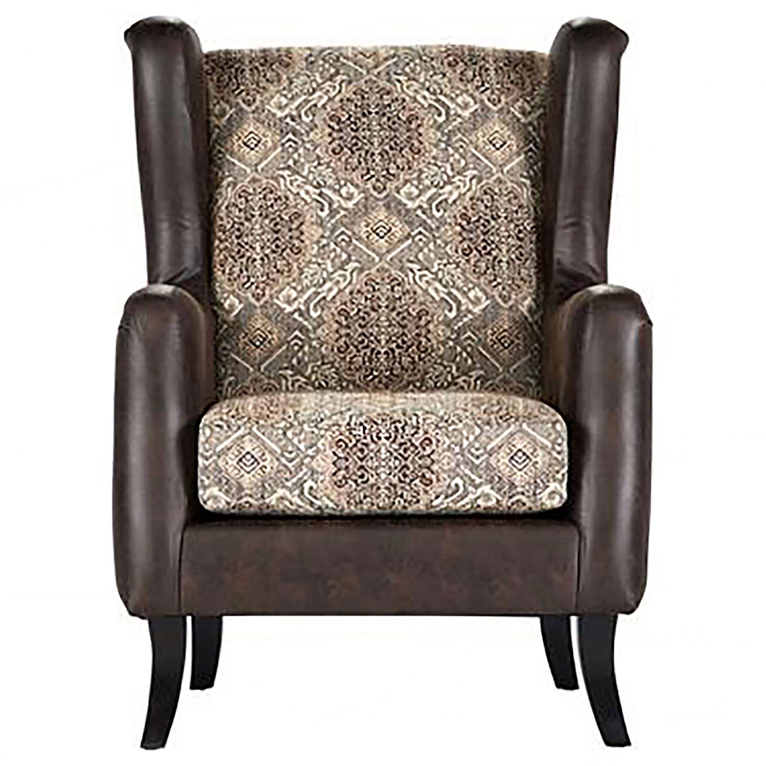 Play up the traditional ambiance of your living room or den with a timeless wingback accent armchair. Perfect for lounging, it boasts plush foam cushions with two-tone upholstery that creates a sense of depth and dimension. The sides, arms, and outer surface of the chair feature dark brown faux leather upholstery, offering sleek, refined ambiance. The seat and back cushions are a lovely brown-toned jacquard patterned upholstery that adds richness and dimensionality you'll love in your living room. Gently flared legs complete the look with a dark brown finish that offers matching flair.