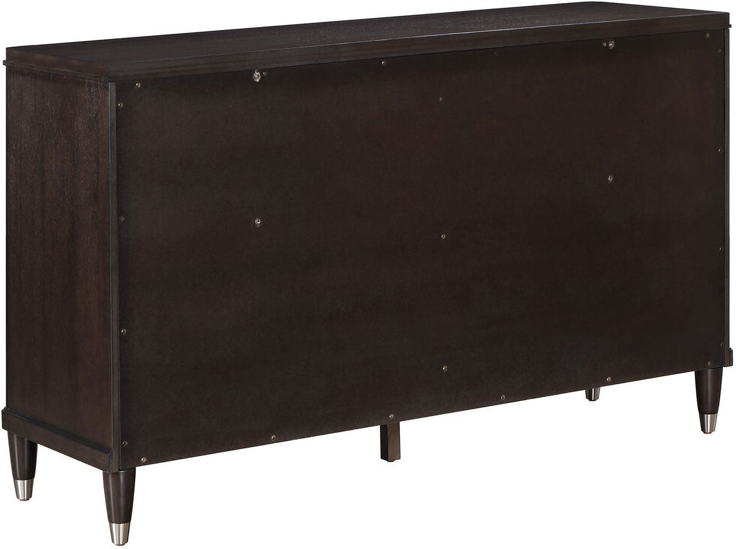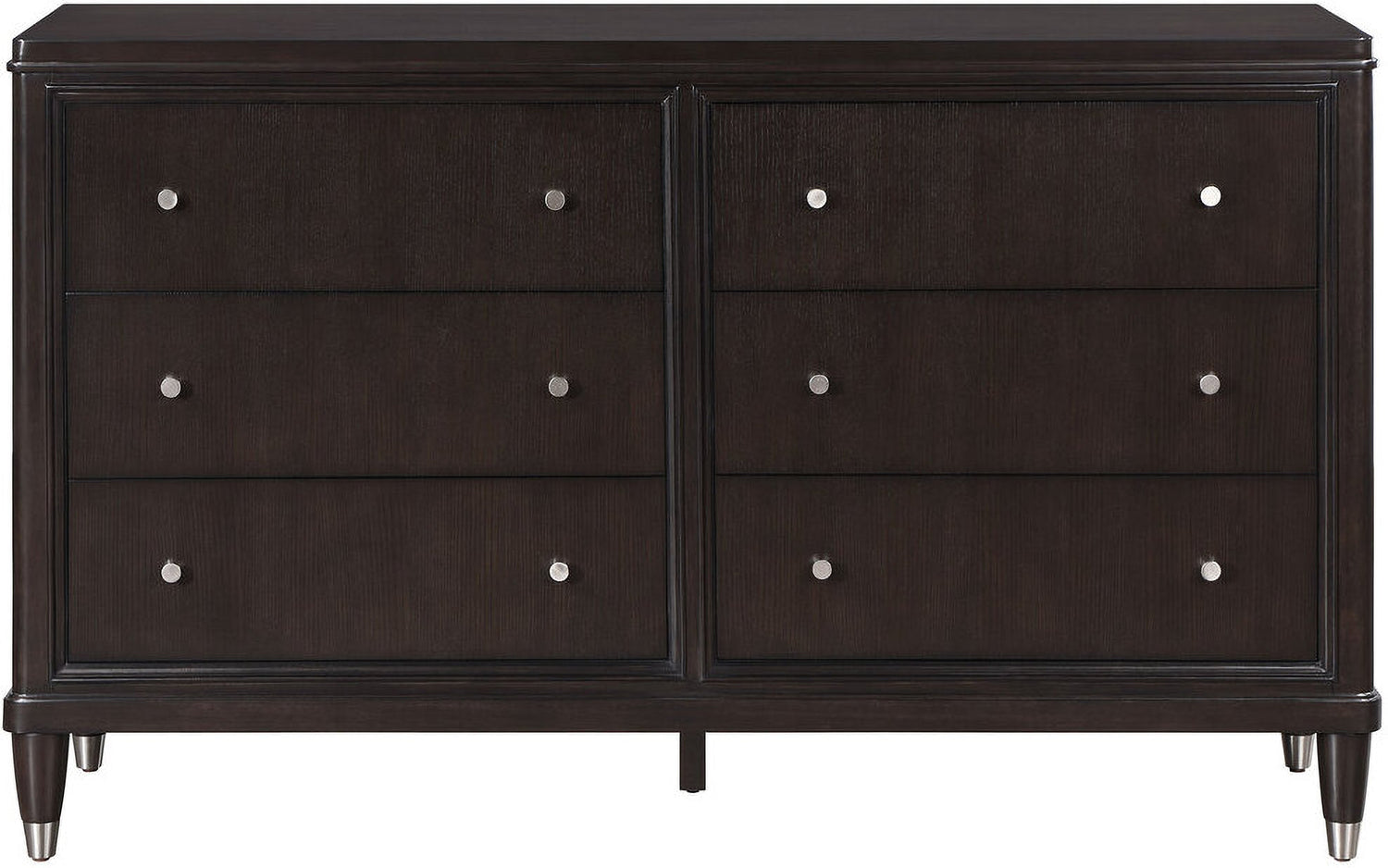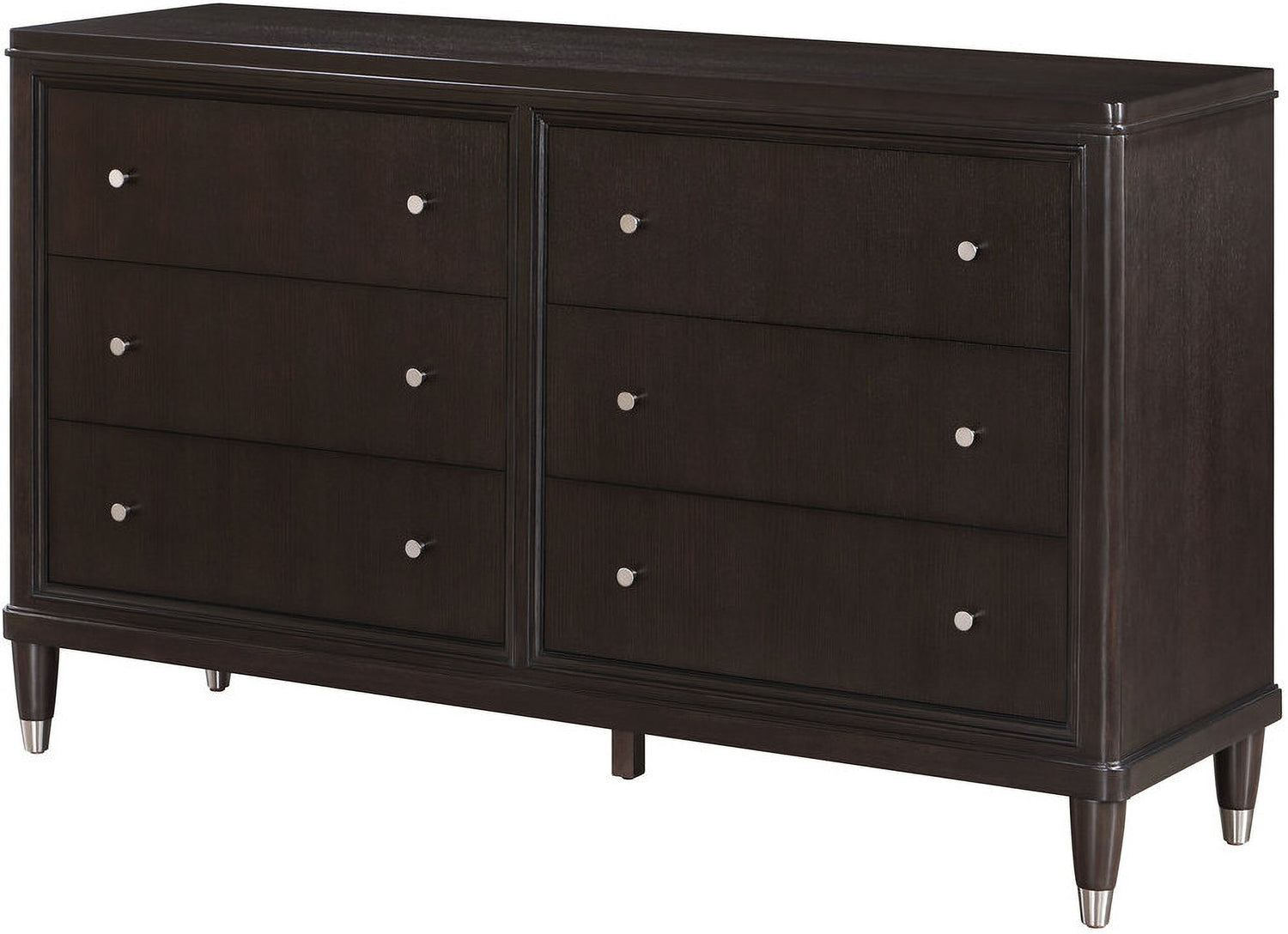 - Tapering feet feature metallic finish caps that match round knobs on the drawers