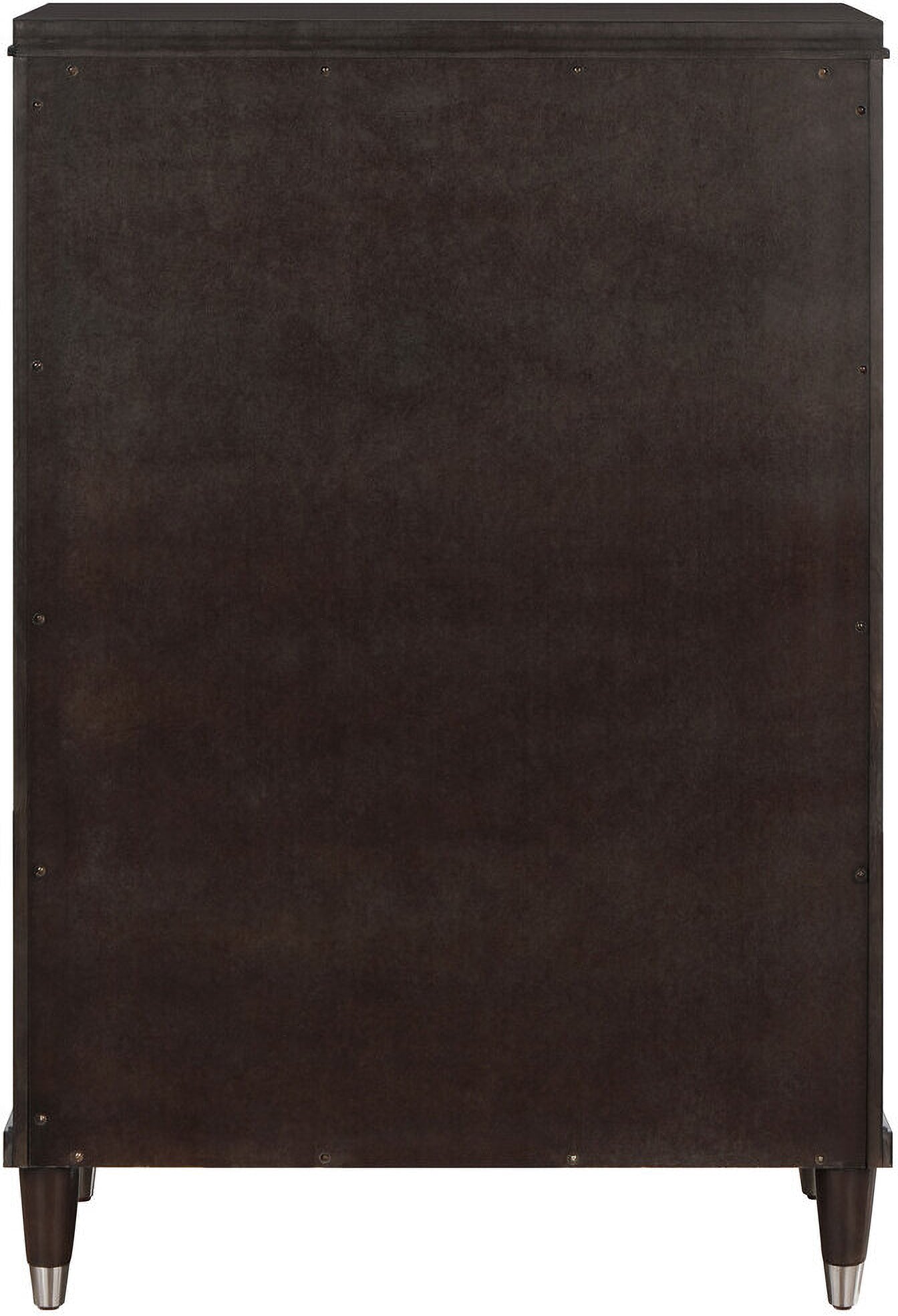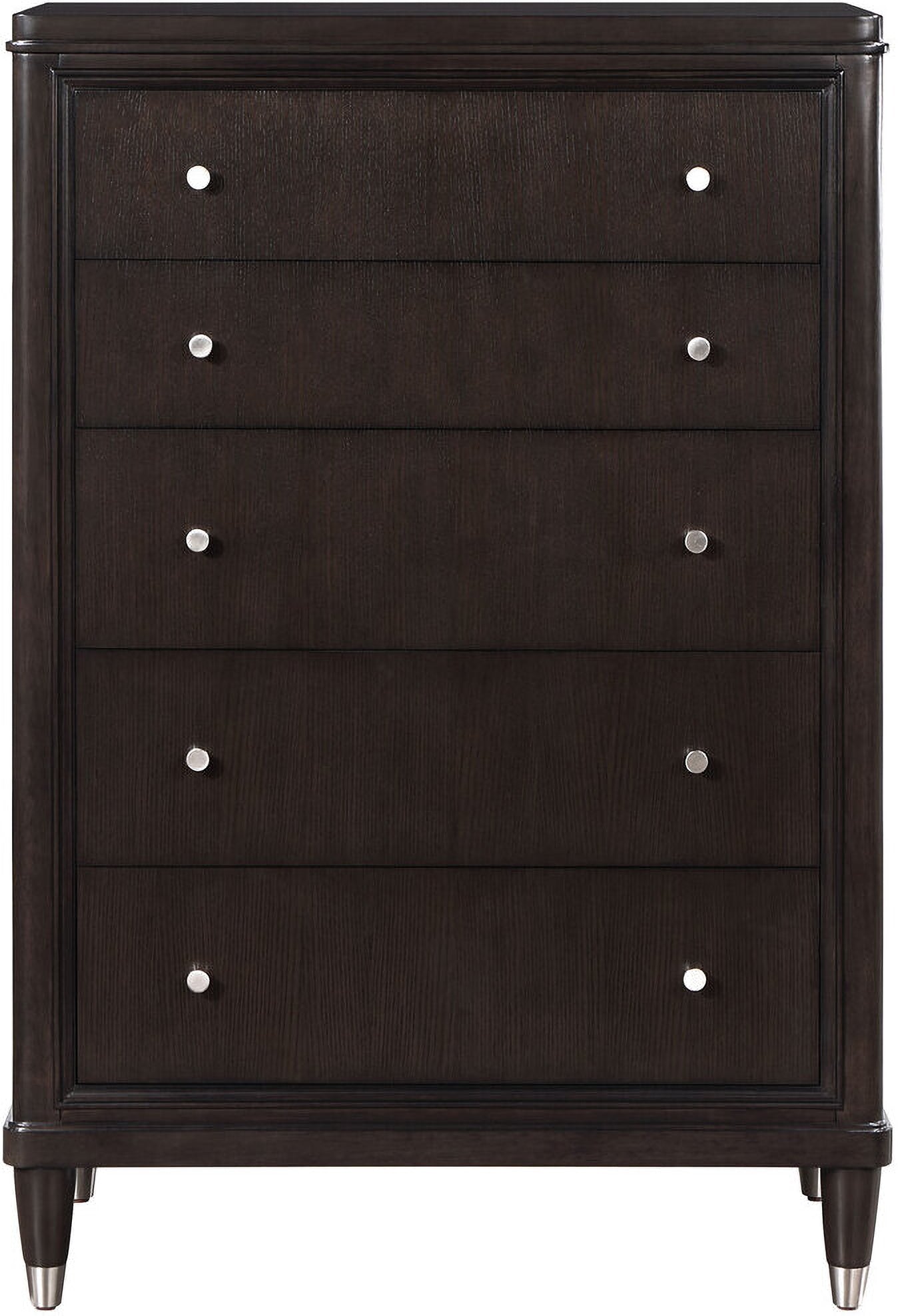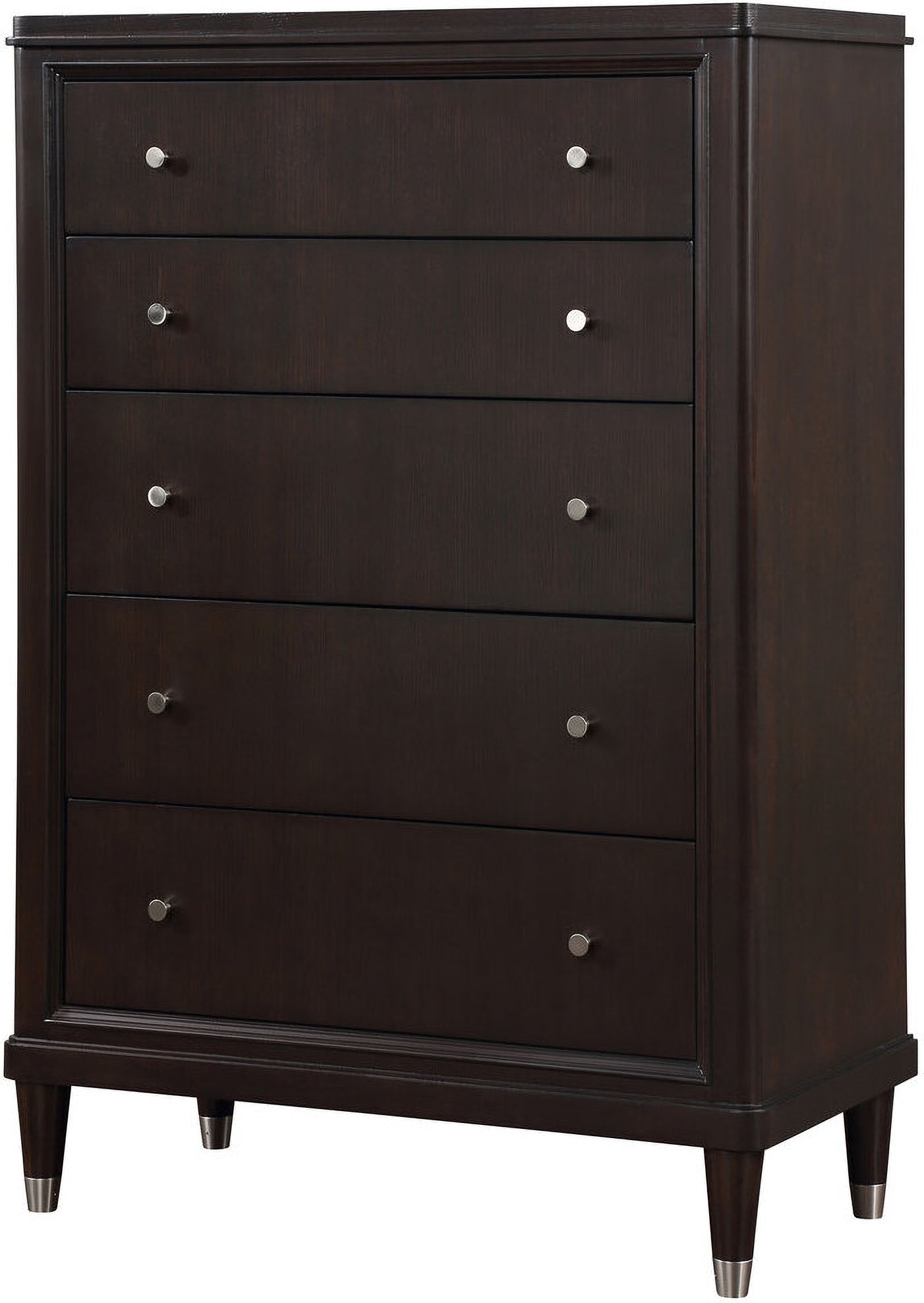 - Tapering feet feature metallic finish caps that match round knobs on the drawers