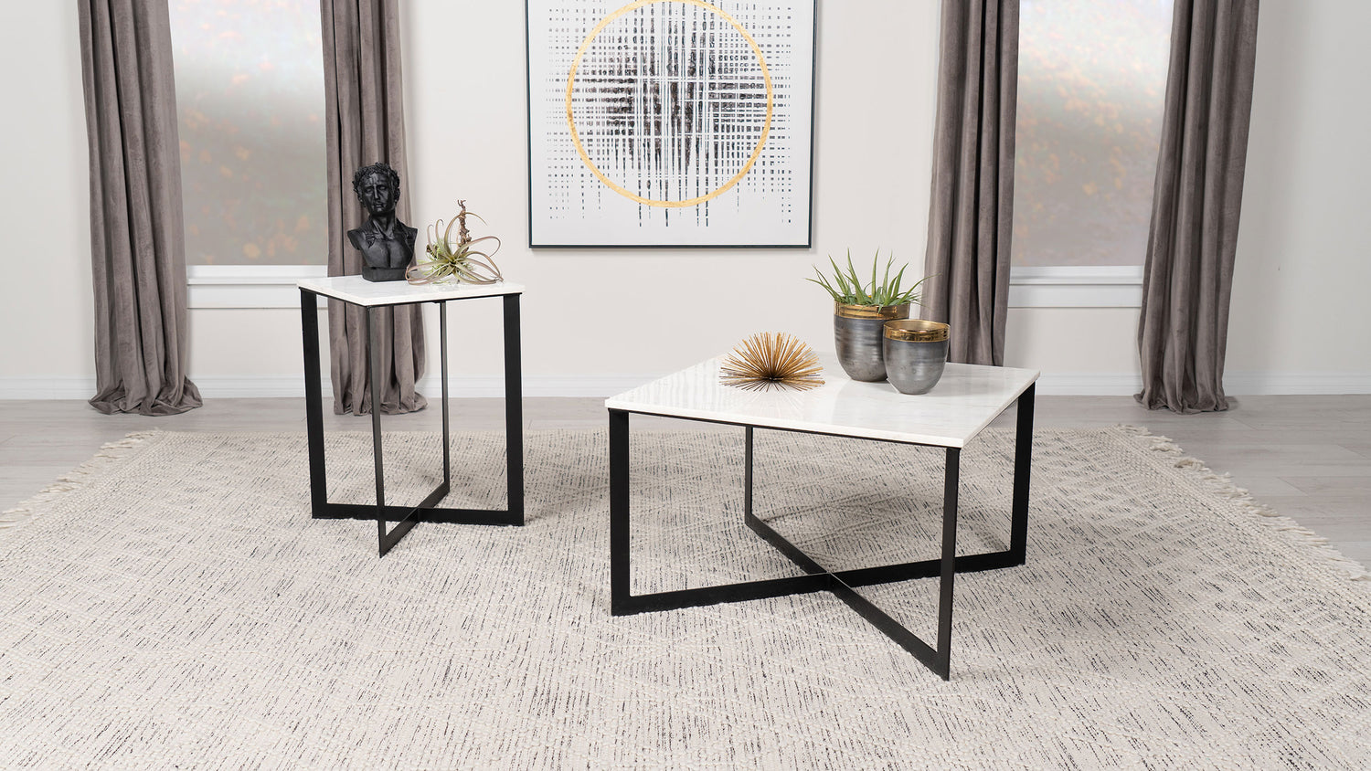 Clean lines take on a geometric look with extra personality, perfect for infusing some energy into your casual space. The Tobin end table and its contrasting palette becomes a focal point in any living room or bedroom. Feast your eyes on a crisply structured thin black finish metal base forming an eye-catching crisscross profile. Embellished with a marble top offering variations of white and touches of gray, this table creates inherent elegant style. Perfect for use as a sofa or chair partner, or as a display venue for greenery or décor.