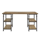 The factory collection achieves its look by fusing between modern design and a historical industrial aesthetic. in this chic solution for a home office, burnished rustic solid wood planks are framed with metal supports that have the appearance of wrought iron. the desk incorporates dual base support shelves that take their design cues from the racking that may be seen in a variety of industrial environments. there is also a bookcase that goes with the theme available.