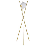 Downscaled style delivers artisan charm in a lamp with a special look that elevates your bedroom or living area. The Yamileth floor lamp makes more out of less, blending gold finished metal with a chic glass shade. A wispy geometric silhouette forms from crossed rods that end in a tripod base. A round frosted white glass shade filters ambient lighting beautifully, creating a glow when on and a delicate element when off. Turn this lamp on and off from a long cable mounted foot switch.