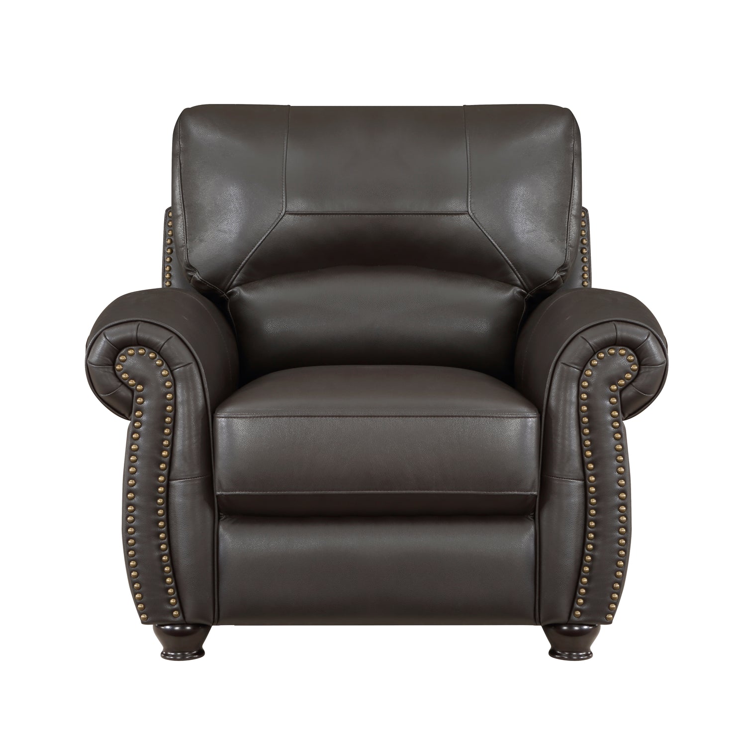 The style of the foxborough collection is one that will stand the test of time because to its combination of traditional design and classic embellishments. the luxurious seating of the chair is upholstered in top-grain leather of a dark brown color all over the sections that the hand can reach, while the remaining areas are covered with a faux leather match. the overall appearance of the seating arrangement is characterized by opulently rolled arms, plush seatbacks, and nailhead trim.