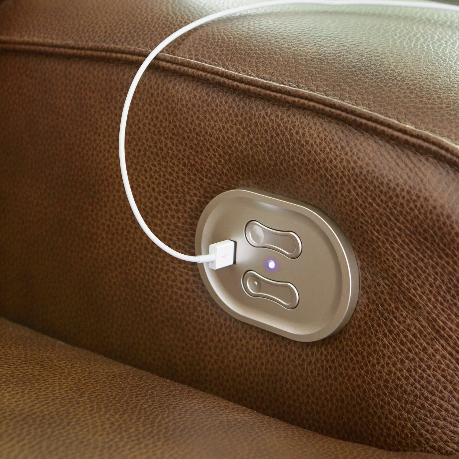 Master statement-making contemporary comfort with this power reclining sofa. It displays a striking yet streamlined profile, with auburn-hued leather match upholstery balancing natural beauty and refined design. Adjustable headrests and USB charging polish off this richly crafted piece.