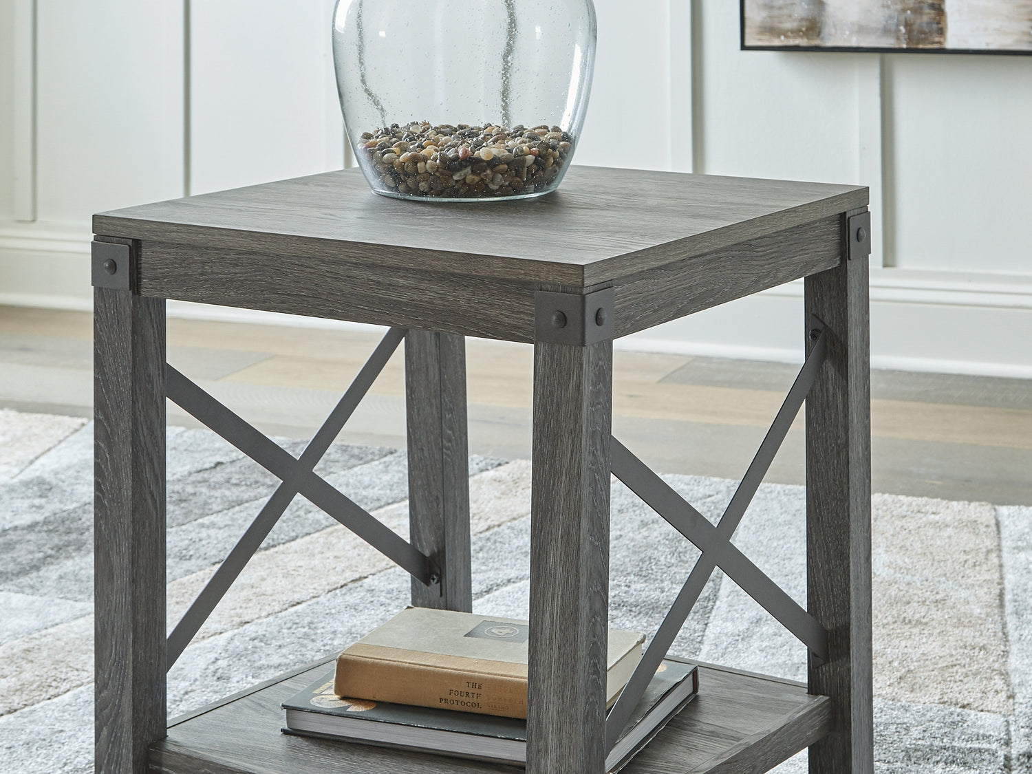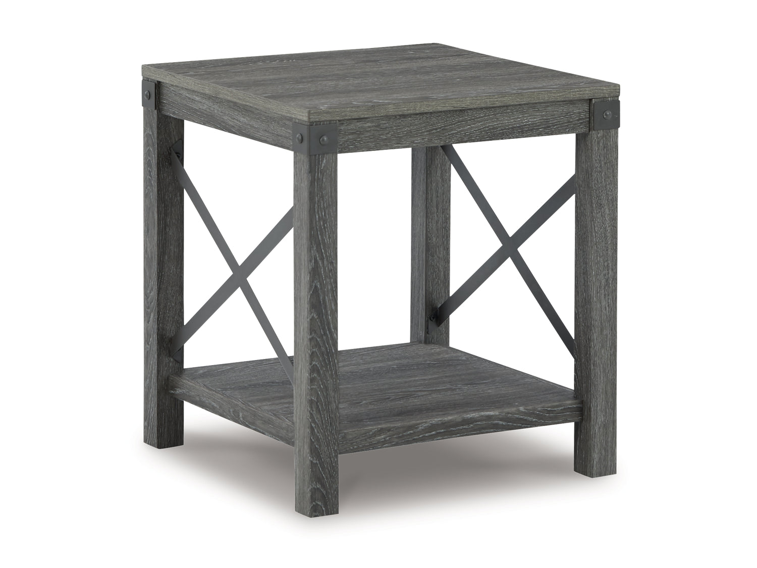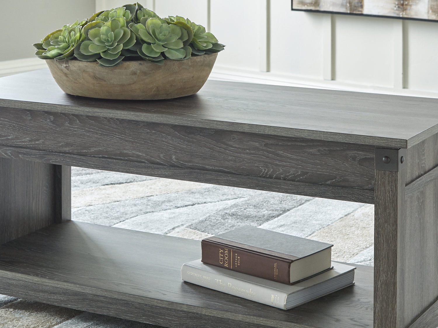 Series Features: Modern Farmhouse design. Made with engineered wood substrate and decorative paper laminate in a replicated gray wood. Cross-buck metal accents are finished in a gun metal color. T175-9 cocktail table features a lift top with storage trays underneath.