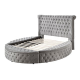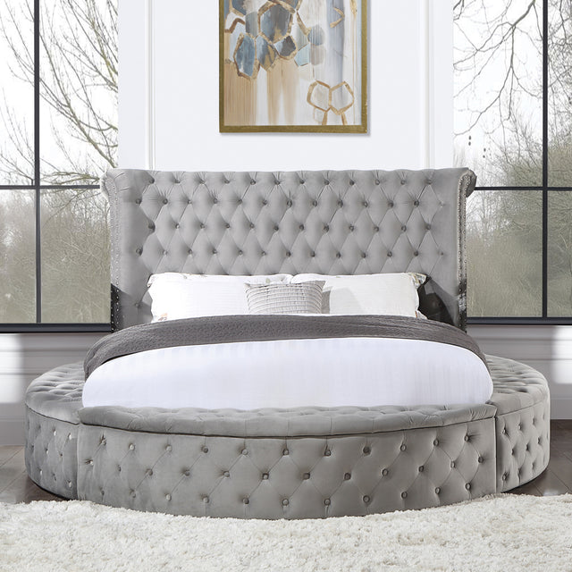 With a lavish movie star modern design, the Gaiva bed adds drama to your bedroom decor. It has a tufted upholstered velvet fabric headboard and footboard. Built on a wooden frame with nailhead applications to add elegance to the bed. Adding further appeal to the piece, the headboard and frame are button-tufted.
