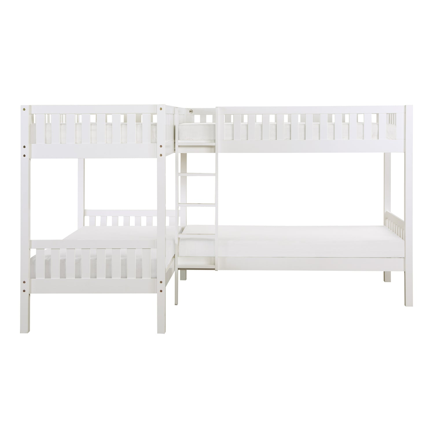 The chic galen collection will help you make the most of the space you have for sleeping. the fact that this corner bunkbed in a transitional style comes in a white finish makes it a good choice for a variety of different kinds of settings in youth bedrooms. the unit consists of four twin beds, all of which may be joined together to take up the smallest possible amount of space.