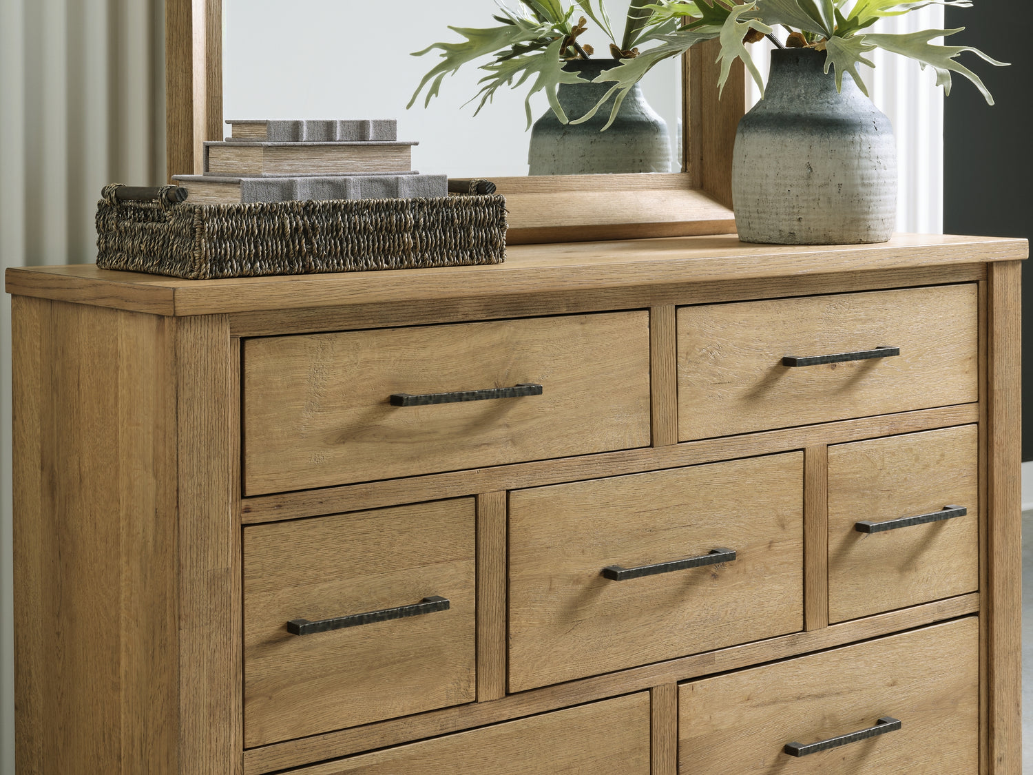 Series Features: Urban contemporary design with a rustic vibe. Made with hardwood solids, and thick rustic oak veneer. Natural wood may display natural weathering, unique cracks, splits, knots, saw marks or other organic features unique to each piece. Glazed natural light oak color finish enhances the natural characteristics of the veneer. A sturdy panel bed features a rustic design with thick planked lumber look. B841-92 night stand features a composite cement tile inlay and includes a 110V power supply with dual USB charging ports. All drawers feature French/English dovetails with fully finished interiors and ball-bearing side glides. Thick metal bar pulls feature a hammered textural surface in an aged bronze finish.