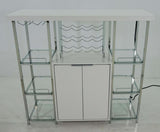 Cool and contemporary, this white bar cabinet exudes modern elegance. Crafted with sleek, shining lines of metal electroplated in chrome, it has a posh, polished look that will make your decor pop. Six tempered glass shelves and a stemware rack provide ample space for barware and wine glasses. A generous, two-door cabinet provides even more storage space. Complete with a wine rack with room for 12 bottles, this contemporary bar unit has everything you need for a complete home bar setup.