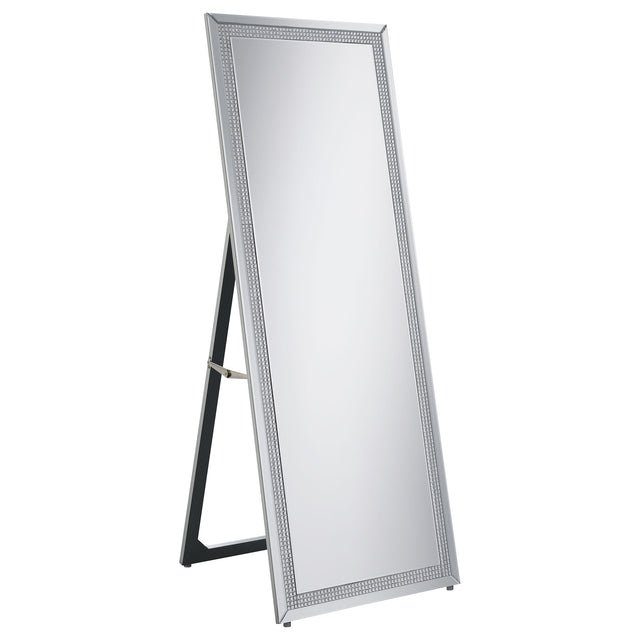 Adorned with delicate details, this silver cheval mirror emits a glamorous aura. Floor length and rectangular, the beveled mirror is complemented by a sleek frame. Three rows of crystals line the inner frame and add depth. Open up the smooth, foldable back to stand the mirror up. Great for a bedroom or living room, this mirror is clean and stylish.