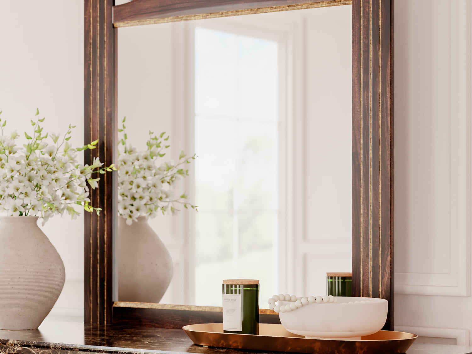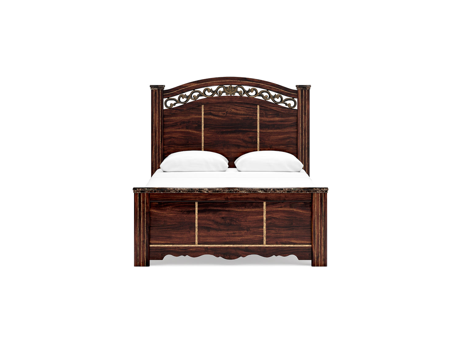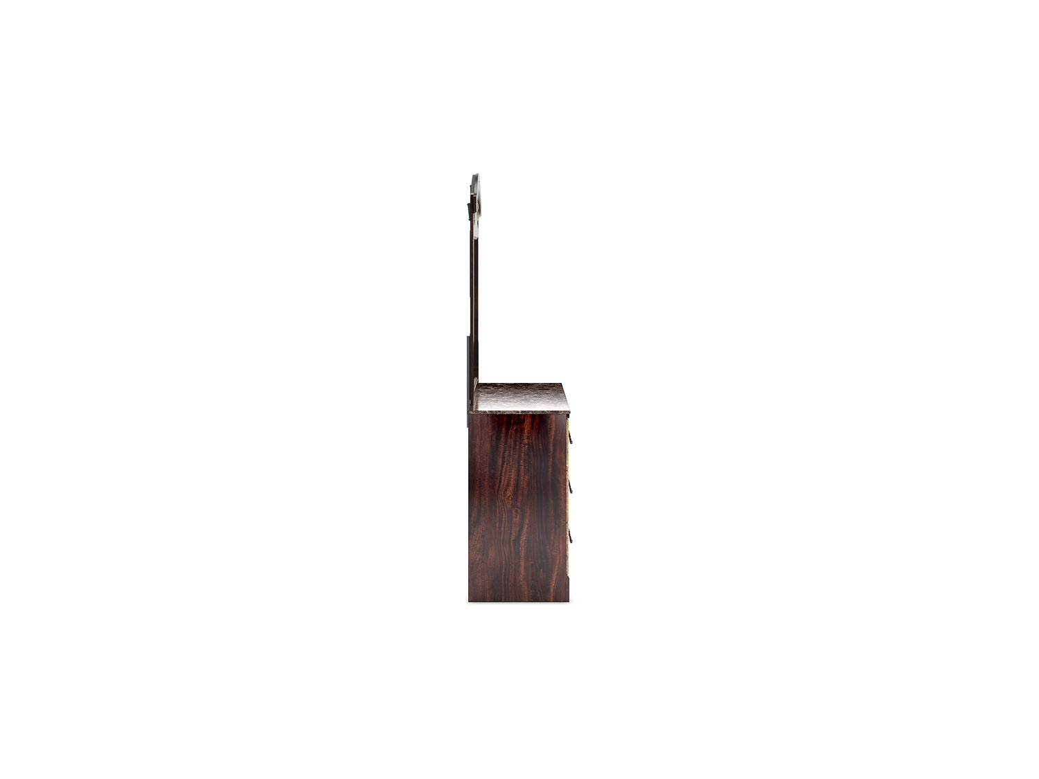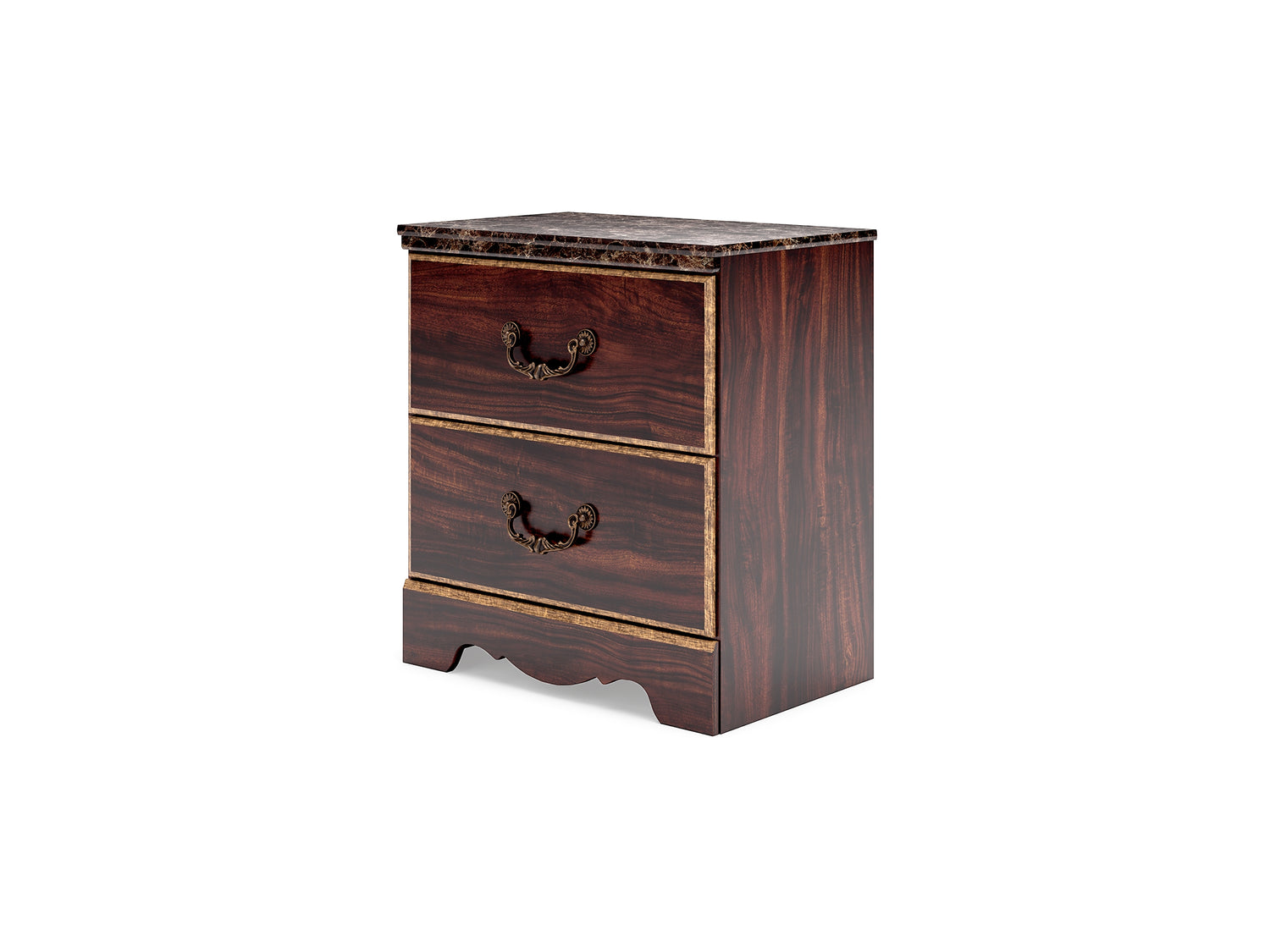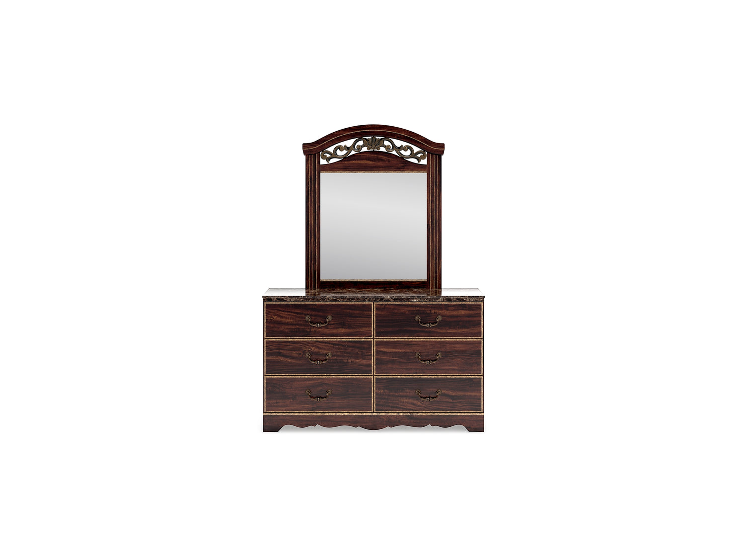 Series Features: Glossy reddish/brown finish over replicated cherry grain, paired with a glossy faux stone. Cases feature antiqued gold finishing and traditional cut-out base rails. Accented with large-scale antique gold color handles. Side roller glides for smooth operating drawers. Drawer interiors are lined with a faux linen laminate for a clean finished look. Slim USB charger located on the back of the nightstand tops. Mirror and bed feature ornate crown inserts. Queen (67) and king (68) headboards can attach to a bolt-on metal bed B100-31 or B100-66 respectively. Safety is a top priority, clothing storage units are designed to meet the most current standard for stability, ASTM F 2057 (ASTM International). Drawers extend out to accommodate maximum access to drawer interior while maintaining safety. Minor assembly required.