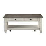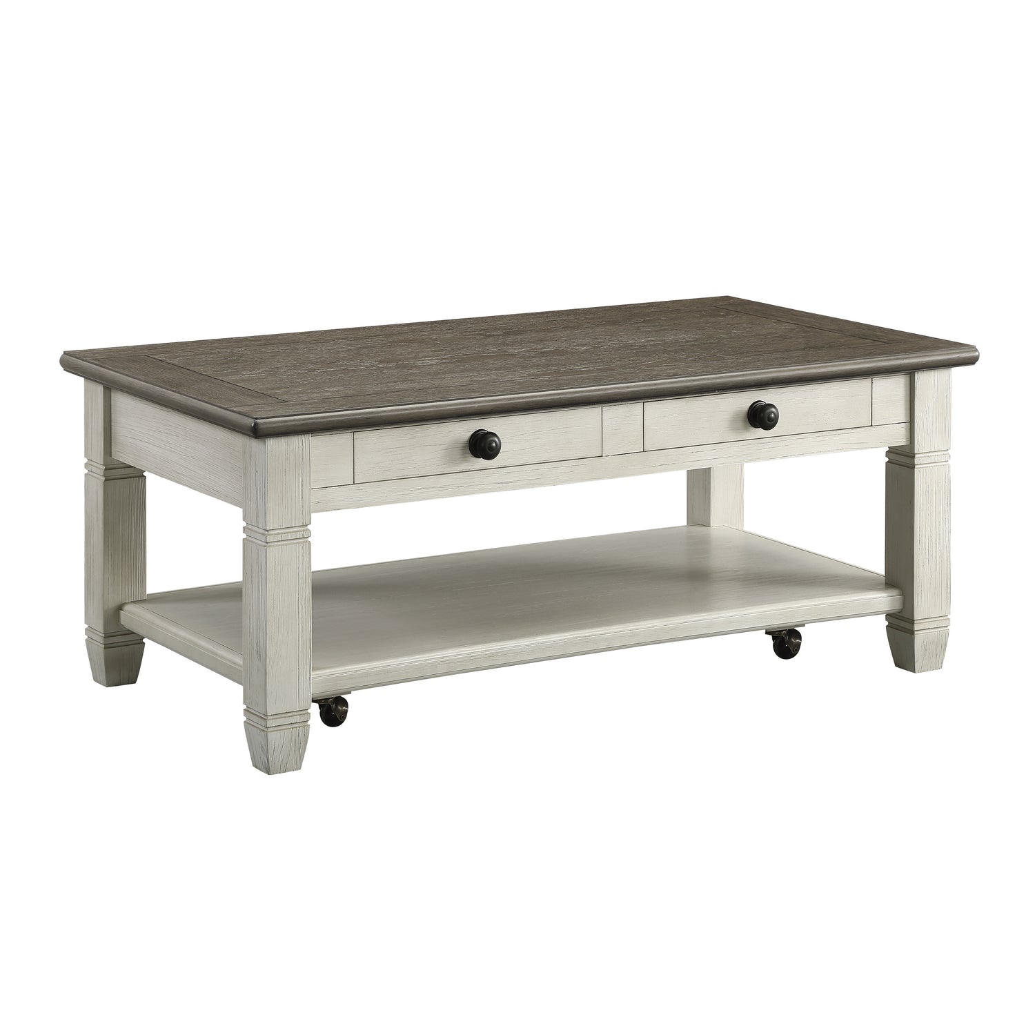 The granby collection has an occasional table set that is both aesthetically influenced by the style of a casual country home and functionally designed to provide a decorative accent for your living space. the two-tone appearance of the acacia and pine solids base, which has been finished in antique white, and the oak veneer that covers the top of the cocktail table, which has been finished in rosy brown, present as a color combination that is harmonic and ideal for your house. the cocktail table features metal knob hardware with a dark finish that adorns the fronts of its functioning drawers. this creates a subtle contrast with the overall finish of the collection. while casters make it easy to move the cocktail table around the room, an open display shelf makes it the ideal location for showcasing your assortment of decorative accents.