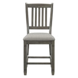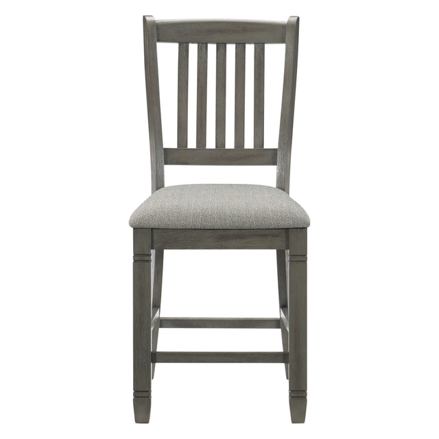 The granby collection is an inviting meeting space for lunchtime with family and friends since it was designed with the style of a casual rural kitchen as its inspiration. the counter-height side chair is made of wood and has an antique gray finish applied to the frame. the seat is upholstered in a neutral tone gray fabric.