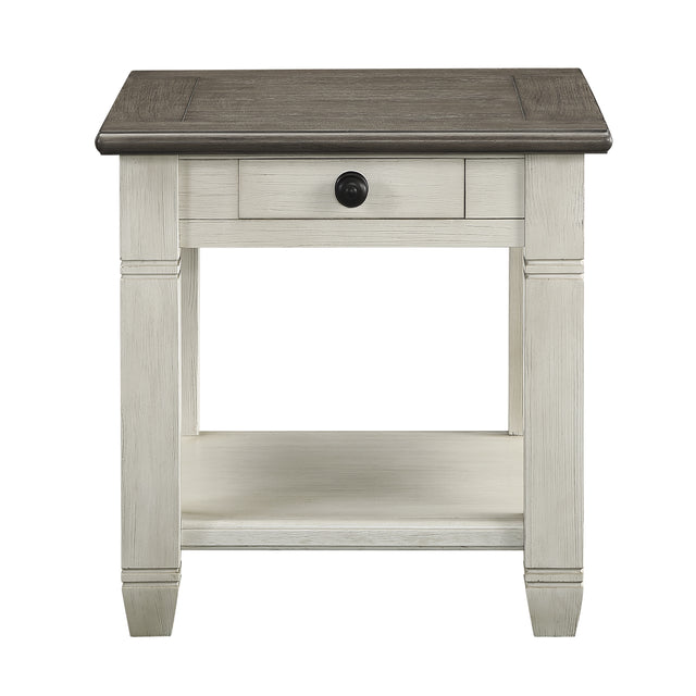 The granby collection has an occasional table set that is both aesthetically influenced by the style of a casual country home and functionally designed to provide a decorative accent for your living space. the two-tone appearance of the acacia and pine solids base, which has been painted in antique white, and the oak veneer of the end table's tops, which have been finished in rosy brown, present as an aesthetically pleasing color combination that is ideal for your house. the knob hardware is made of metal and has a dark finish. it provides a subtle contrast to the overall finish of the collection. your decorative accessories can be put on full show using an open display shelf, which is the ideal location for doing so.