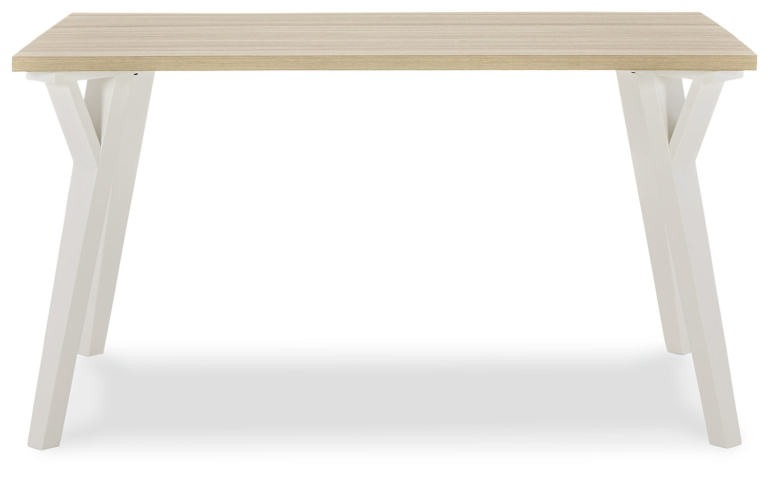 Bring light to your dining area with clean lines and a bright two-tone finish. The rectangular dining table sports stylized saber legs in a white finish for beautiful simplicity. The melamine top in a light tan color provides additional durability, marrying minimalism with big style for a delightful combination.