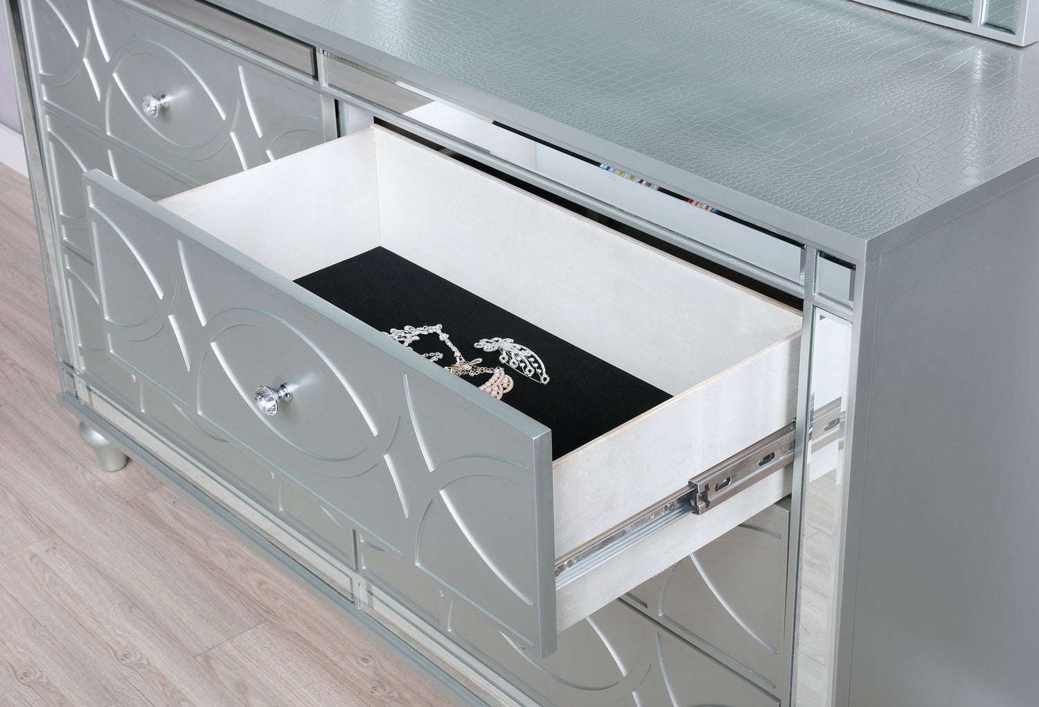 Give your home a modern glam update to classic design with this transitional six-drawer dresser. It features a glitzy design that takes center stage in any modern bedroom. It's fashioned with a vibrant silver metallic finish with fret work detail on the front panels and drawer fronts. The drawers are adorned with crystal-like pulls and the top ones are lined with black felt. Delicate bun feet complete the design of this exquisite showpiece dresser.
