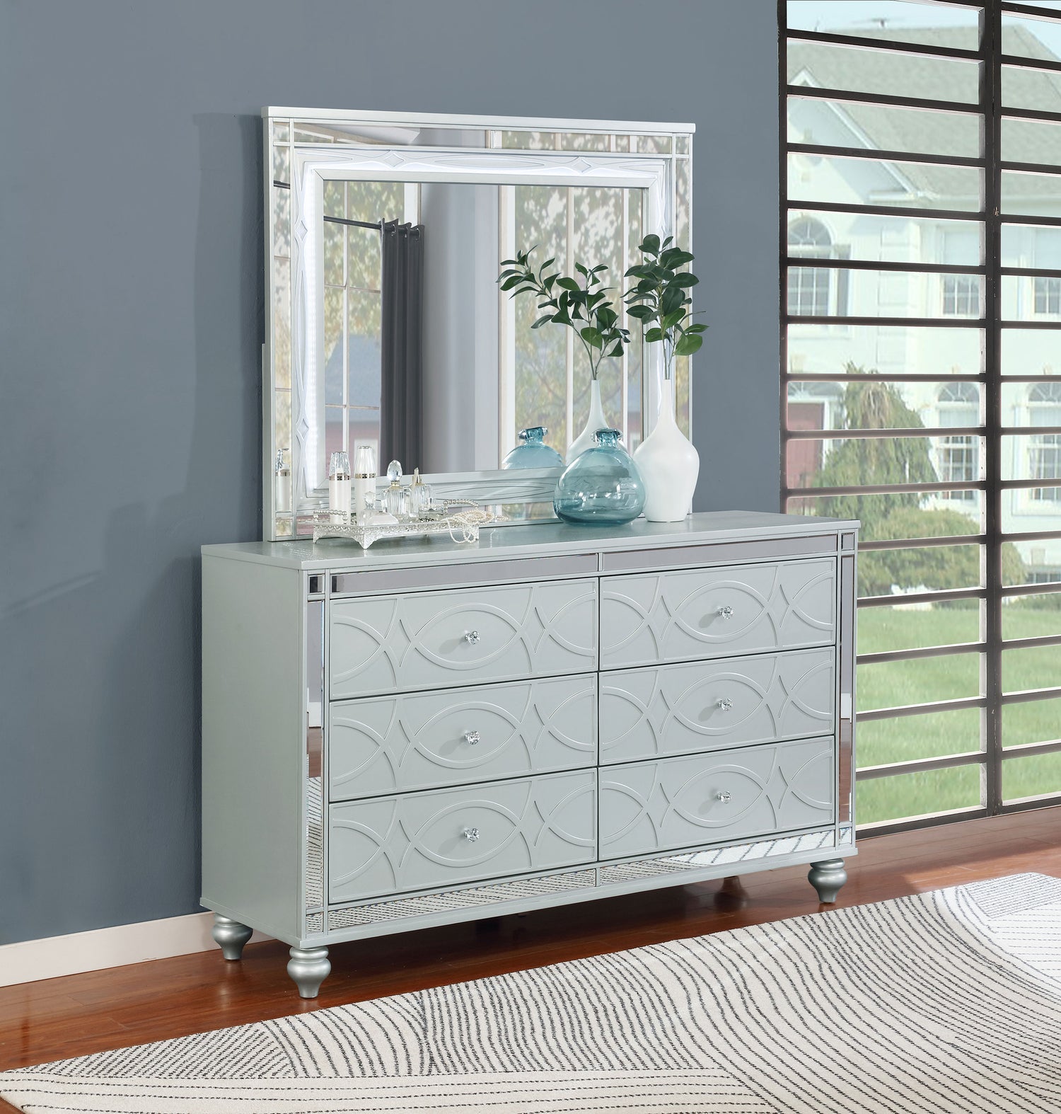 Transform your bedroom with the transitional elegance of our six-drawer dresser and its accompanying mirror. The dresser's vibrant silver metallic finish and fret work detail on the front panels exude modern glam, while the crystal-like pulls and black felt-lined top drawers add a touch of luxury. Delicate bun feet complete this exquisite dresser, making it a stunning showpiece. The rectangular mirror, with its decorative fret work frame and beveled edges, enhances the glamor and radiates sophistication, perfect as a standalone piece or paired with the dresser.