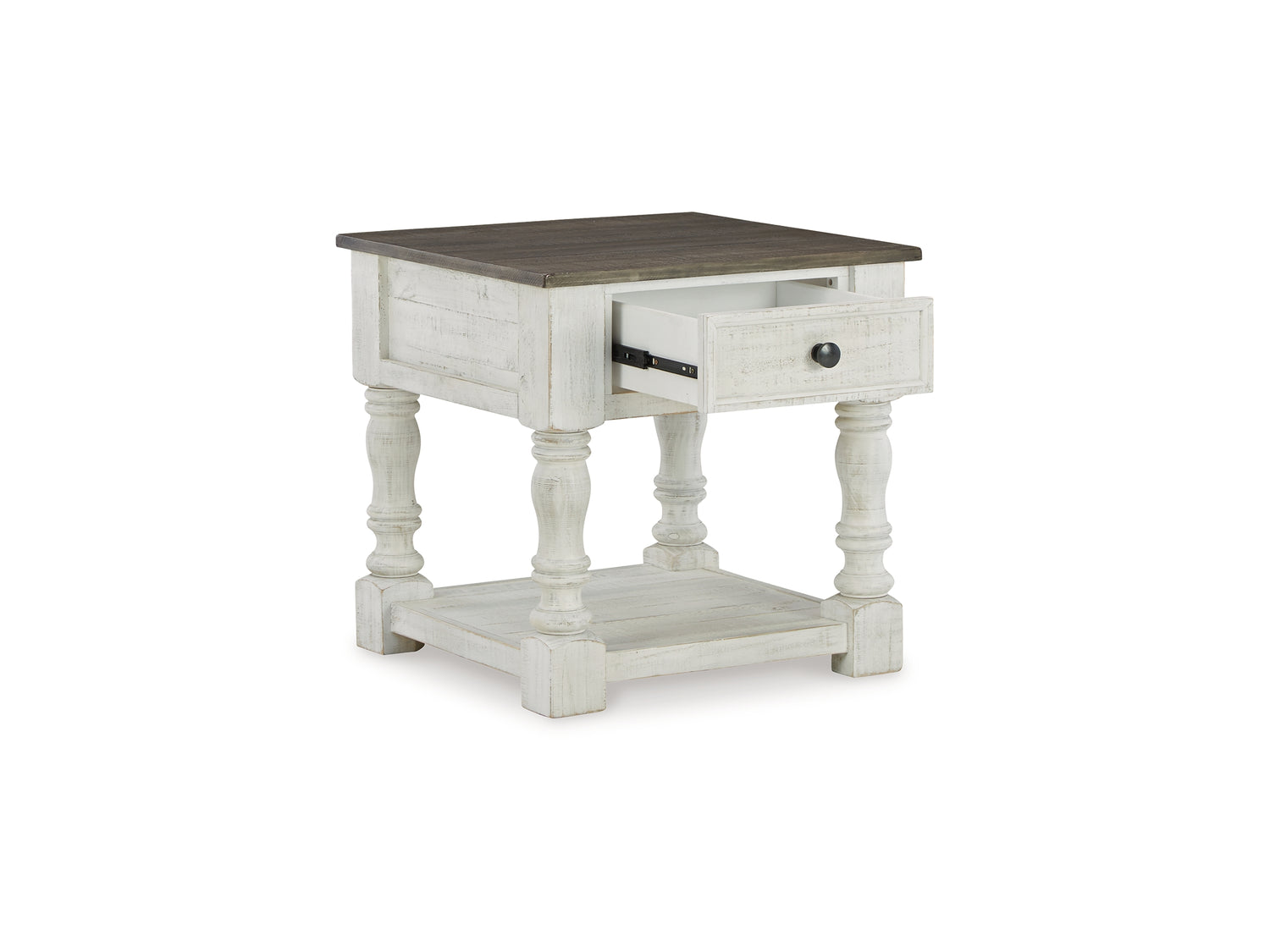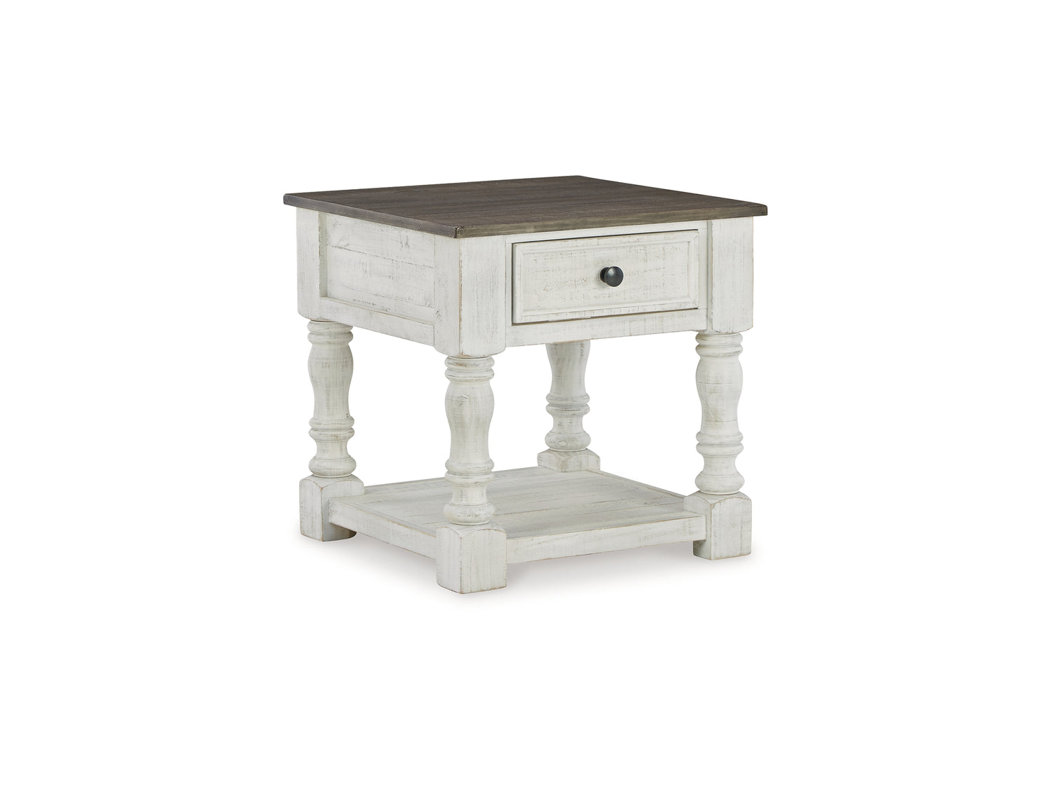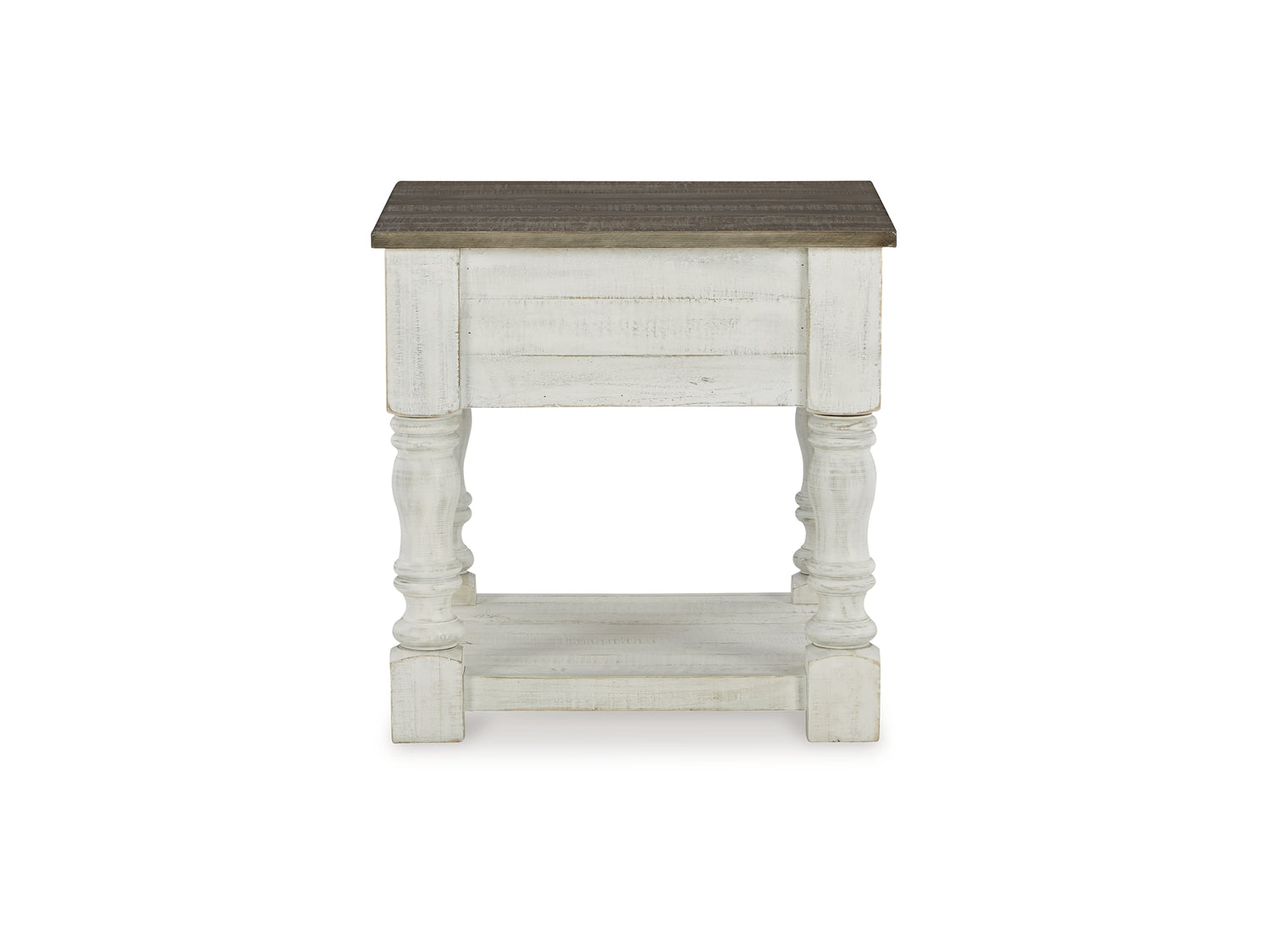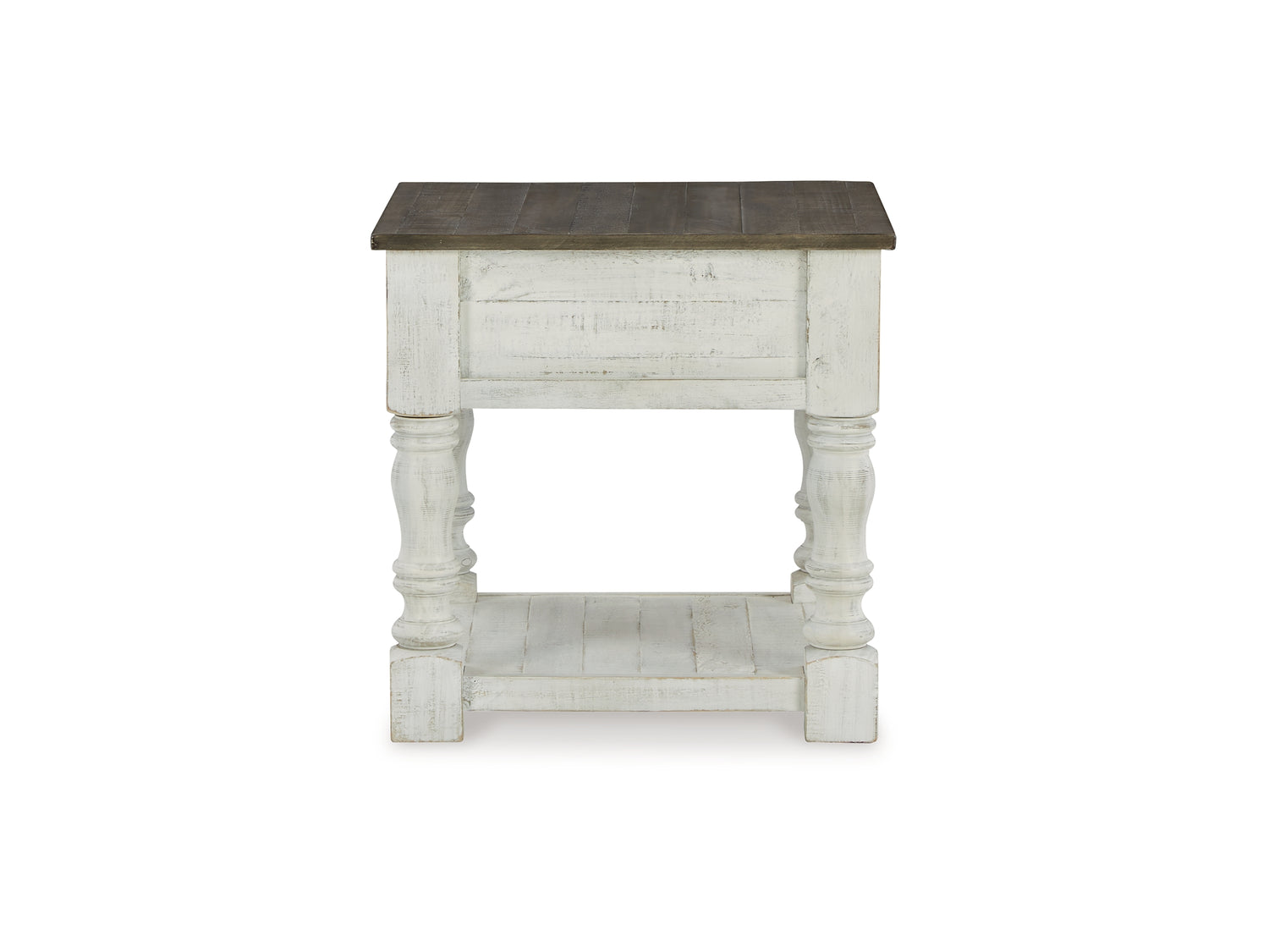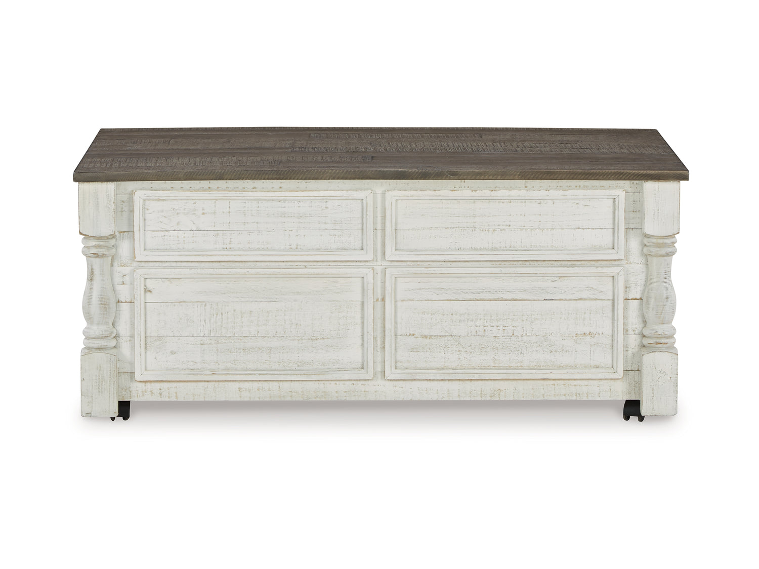Series Features: Casual farmhouse design. Made with Pine solids and veneer with engineered wood substrate. Two-tone finish scheme with distressed weathered gray tops on a vintage white cases. The lift-top cocktail table features four storage drawers, two large drawers on front and two smaller drawers on the sides. A small concealed storage tray under the lift-top for seldom used items. Square end table with a drawer and lower open shelf. A small flip-lid located on the top of the chairside door cabinet conceals a 110V power supply with 2 USB charging ports for conveniently charging your devices.