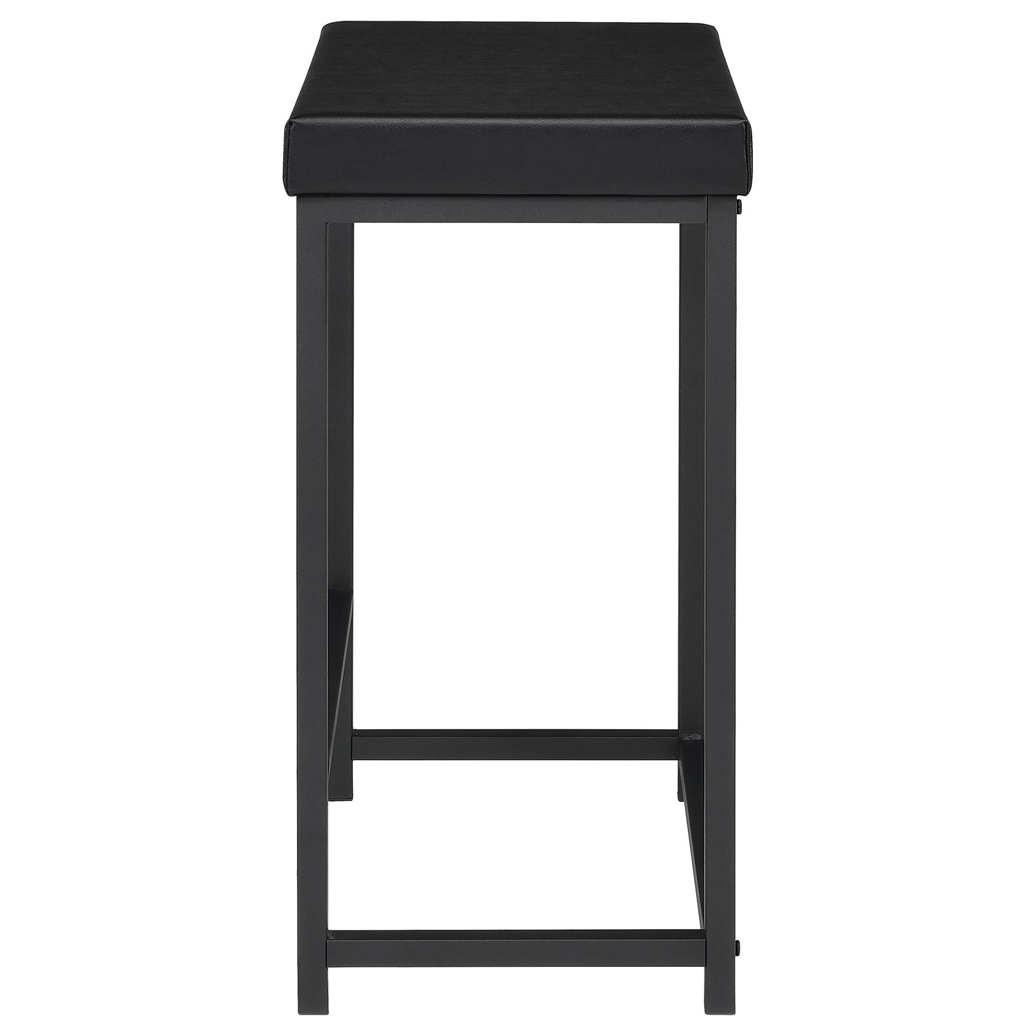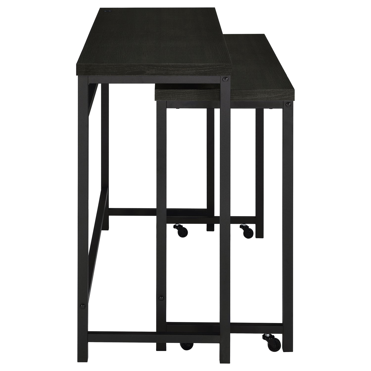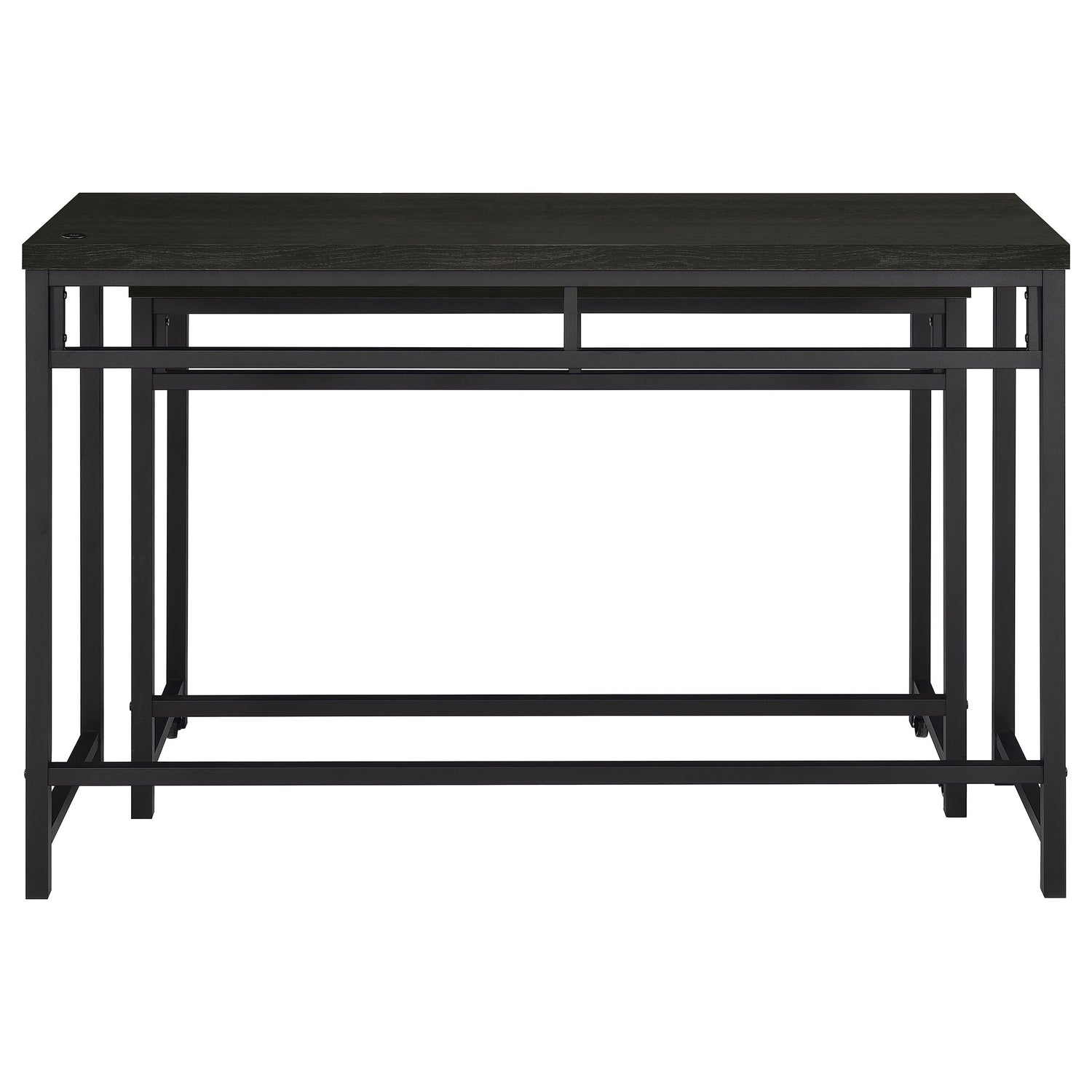When space is at a premium, this modern four-piece counter height dining set does everything you need and more, easily serving as dining table, workspace, or homework spot. It features clean, crisp design with straight lines and square corners, all in a black finish that blends into surrounding decor in virtually any setting. The larger table includes a USB port in its top, while the smaller nesting table is on wheels that allow for easy movement to the perfect position for every occasion. Two stools are backless, with plush foam cushions and faux leather upholstery. Built in footrests offer added comfort and support for all to enjoy.