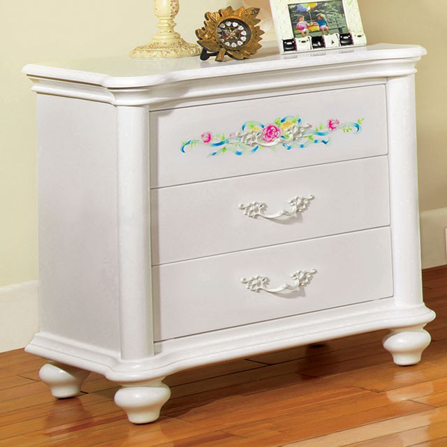 Bright white with flowers painted and a delicate heart motif, these details are a perfect fit for any girl. This night stand, with its radiant white finish, ornate drawer pulls, and blunt-arrow feet, is the easiest way to brighten up the room.