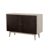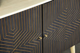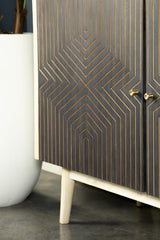 Make for an unexpected display with this incredible accent table. Crafted in India from solid mango wood, its gold geometric pattern forms an eye-catching diamond design on each cabinet door against a black finish. Meanwhile, the stark white finish of the frame creates an exceptional contrast. Rounded angled legs make for a mid-century modern appeal. This piece adds an eclectic vibe to your living space.