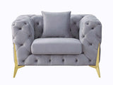 The Jelanea collection is the ideal solution to reflect your regal tastes. The classic design ensures that the pieces offer timeless appeal. The velvet upholstery brings out the glamorous side of each piece, and the metal gold legs offer a contrast to the soft velvet. Exquisite details, such as button-tufted armrests and back elevate the design. The included accent pillows further add to the comfort level of each piece. Complete your living room with these regal seating options.