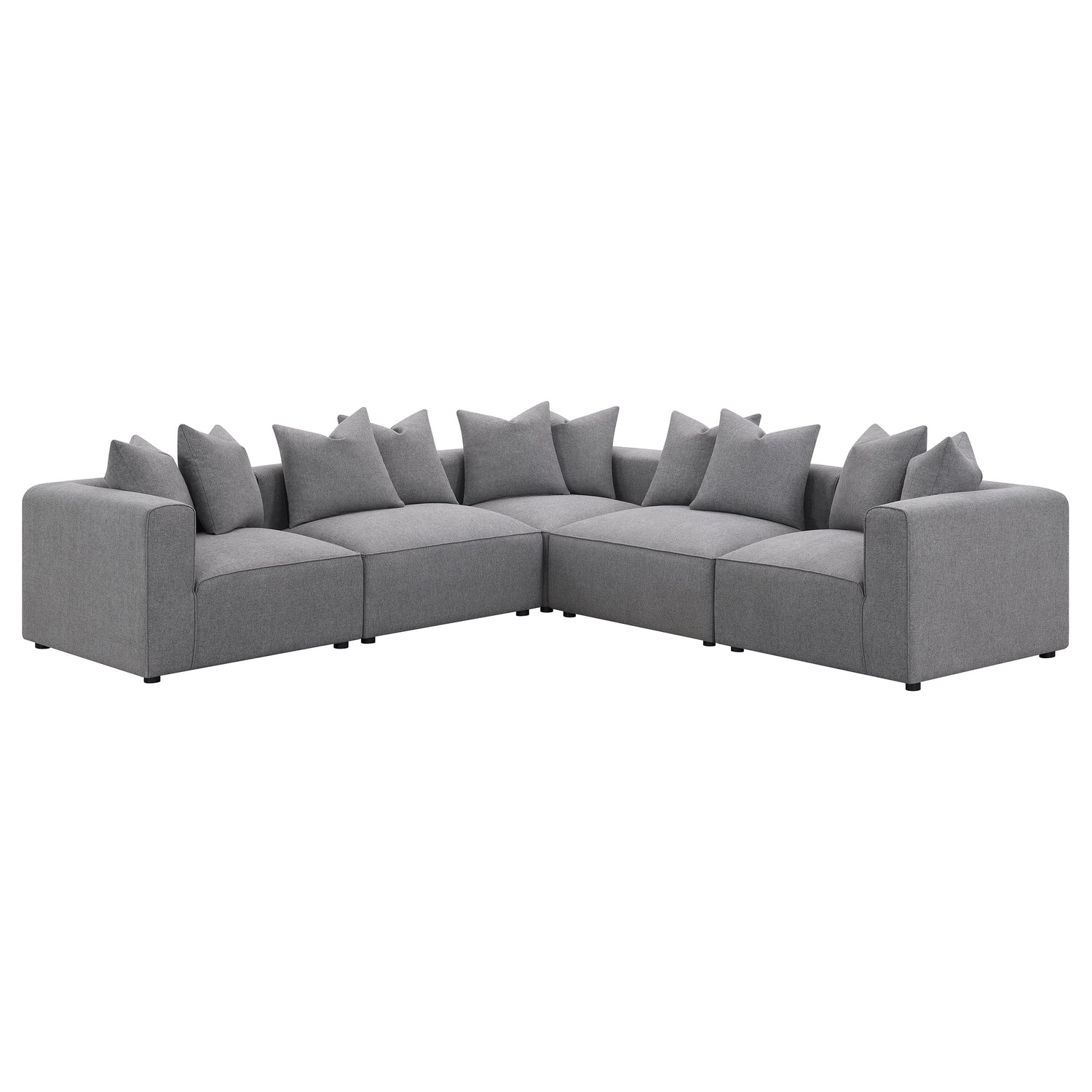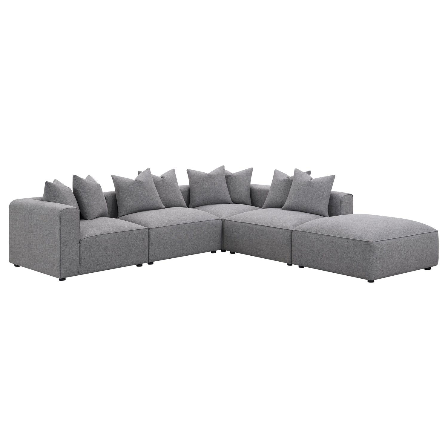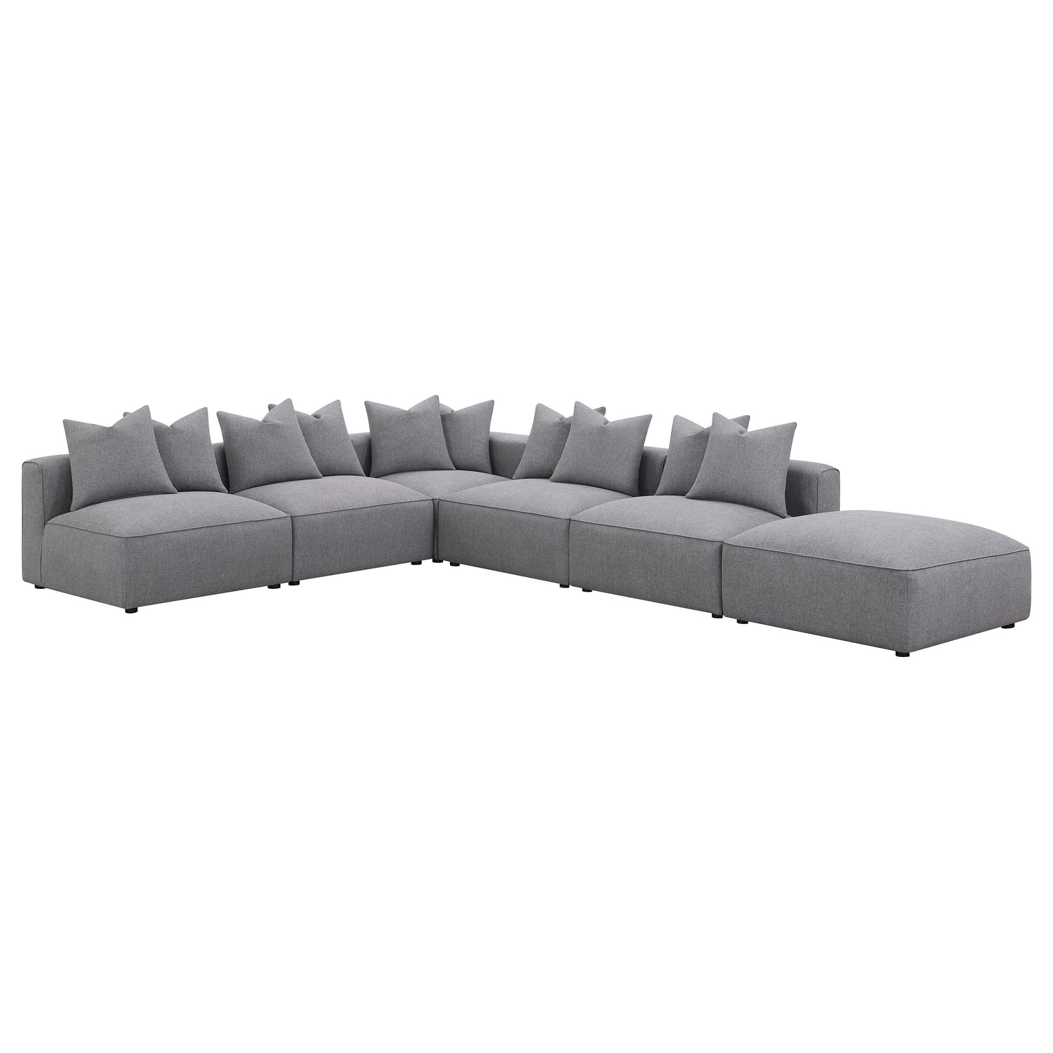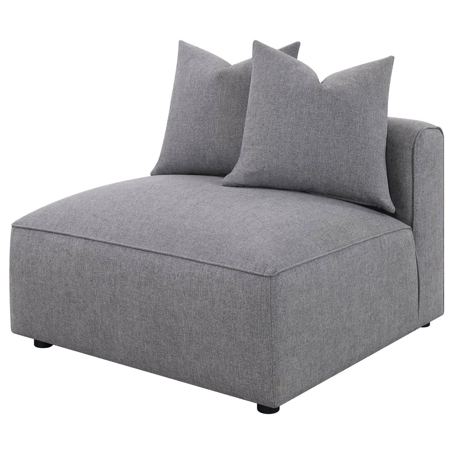 Customize your sectional sofa and slip in this contemporary modular armless chair. A perfect addition to extend your seating capabilities in a living room or entertainment area, this modular chair is as versatile as they come. A neutral color palette presented in the soft grey woven fabric makes it easy to unify your whole look. A low-profile tight seat with matching pillows offers a plush place to lean back and relax. Seamless black legs offer a discreet elevation as welt trim defines the edges.
