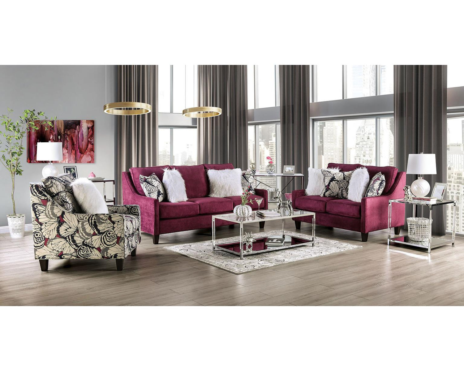 This fun and refreshingly modern design makes for a 'plum' of a sofa, thanks to its dynamic plum chenille fabric. American-made wood construction ensures the finest quality of sofa.