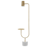 Illuminate your contemporary living room with this eye-catching, modern floor lamp. Designed in a cantilever-inspired style, this striking floor lamp presents a slim metal stand situated on a thick cement base. A slender arm in a gleaming antique brass finish that offers a round tray for resting a drink or book, sweeping upward into a tall spotlight style lamp with a cylindrical shaped shade. Use the light to accent decor on the tray or rotate it toward your living room seating area. The bold, grey cement base grounds this tall floor lamp visually and physically, offering a striking bright accent against rugs and floors while supporting this modern floor lamp.