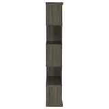 Purposeful imbalance tells a story. Designed with a whimsical profile, this bookcase brightens up a contemporary space. A visually pleasing arrangement of five tiers creates shelf space for books and decor. Finished in a cool weathered grey, it provides versatility and design power. Make this bookcase a focal point in a home office or casual room.
