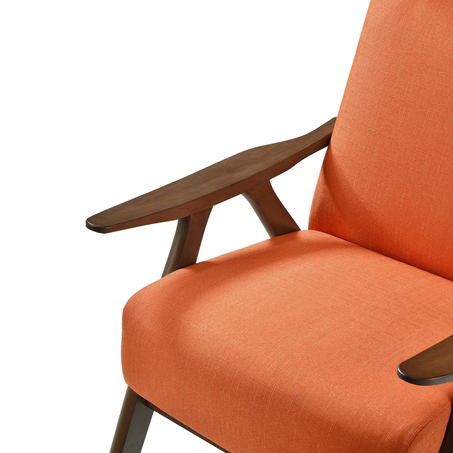 The design of the kalmar collection's frame harkens back to an era when understated elegance reigned supreme in terms of fashion. the high-back chair's arms and legs are made of wood and finished in a walnut color; the seating area is upholstered in an orange fabric that has a feel similar to that of linen. the chair's design is simple and understated.
