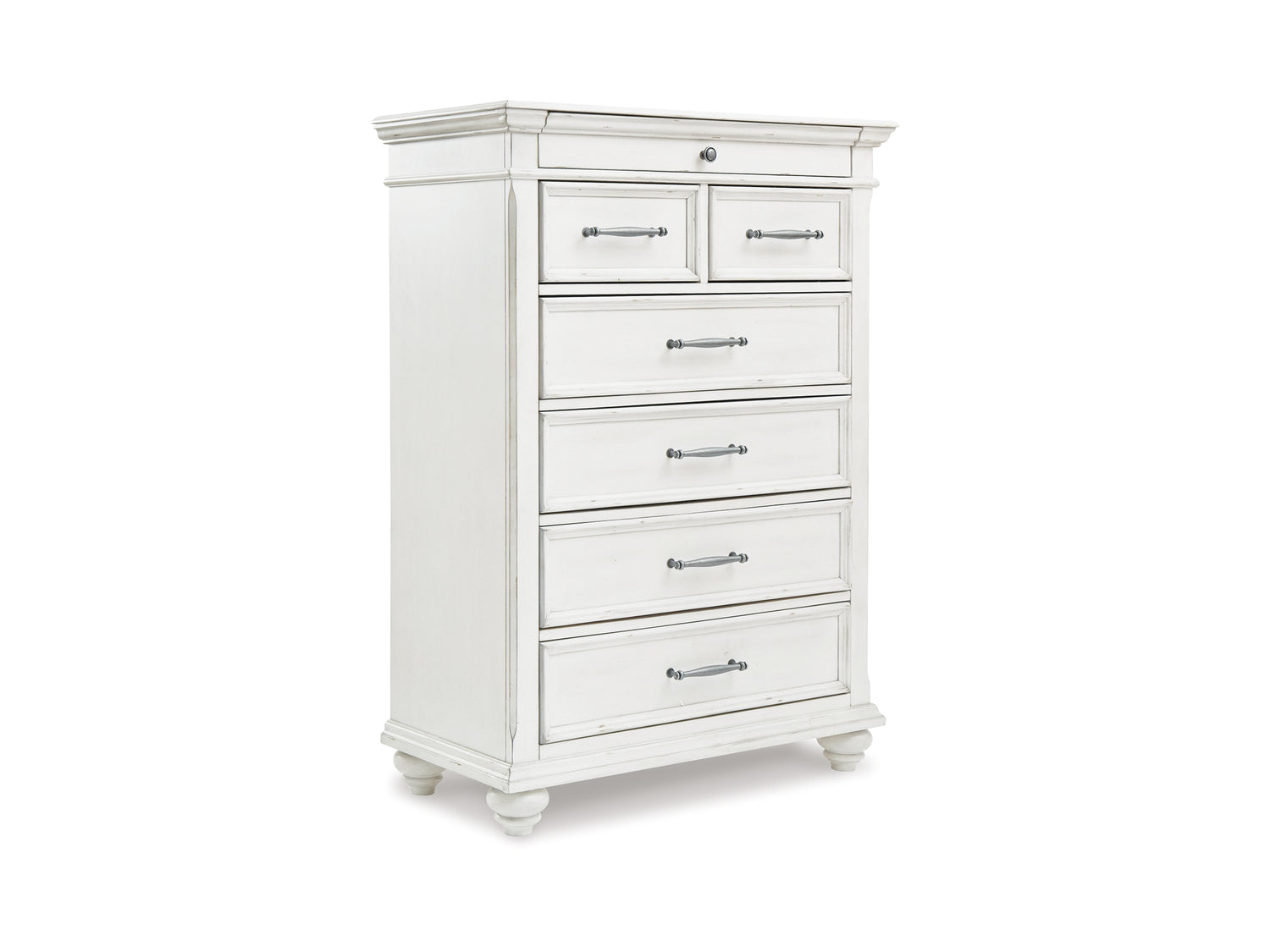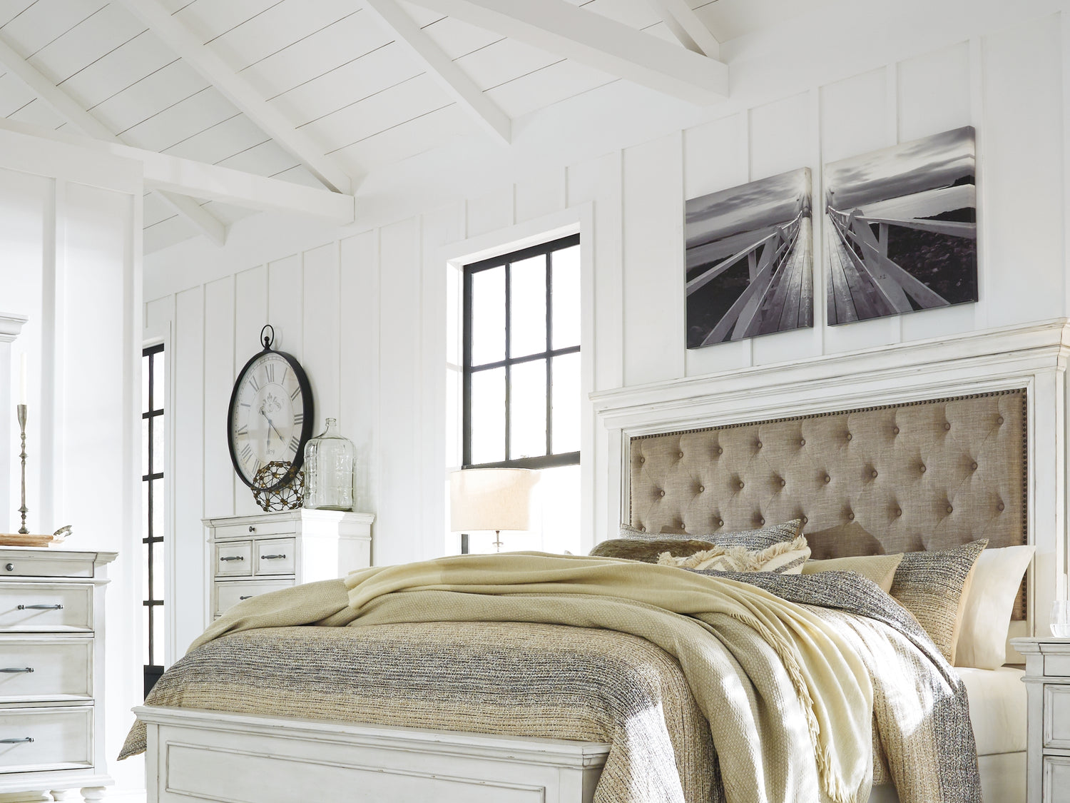 Kanwyn Whitewash Cal King Upholstered Panel Bed, Dresser, Mirror And Chest