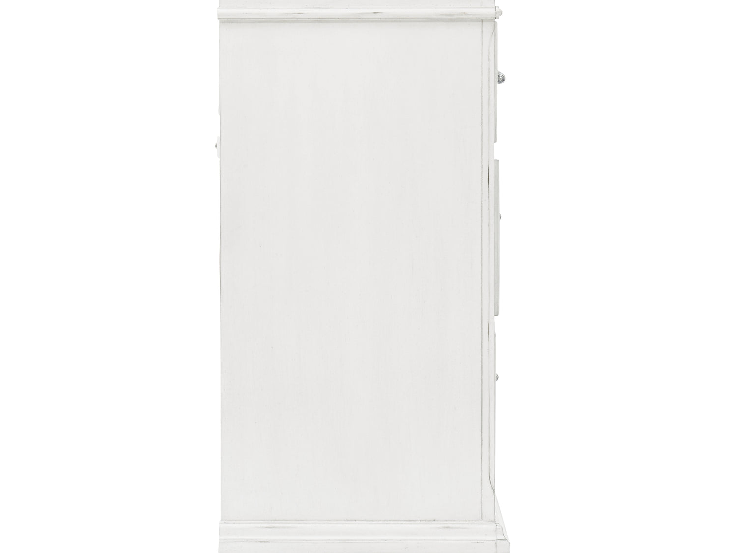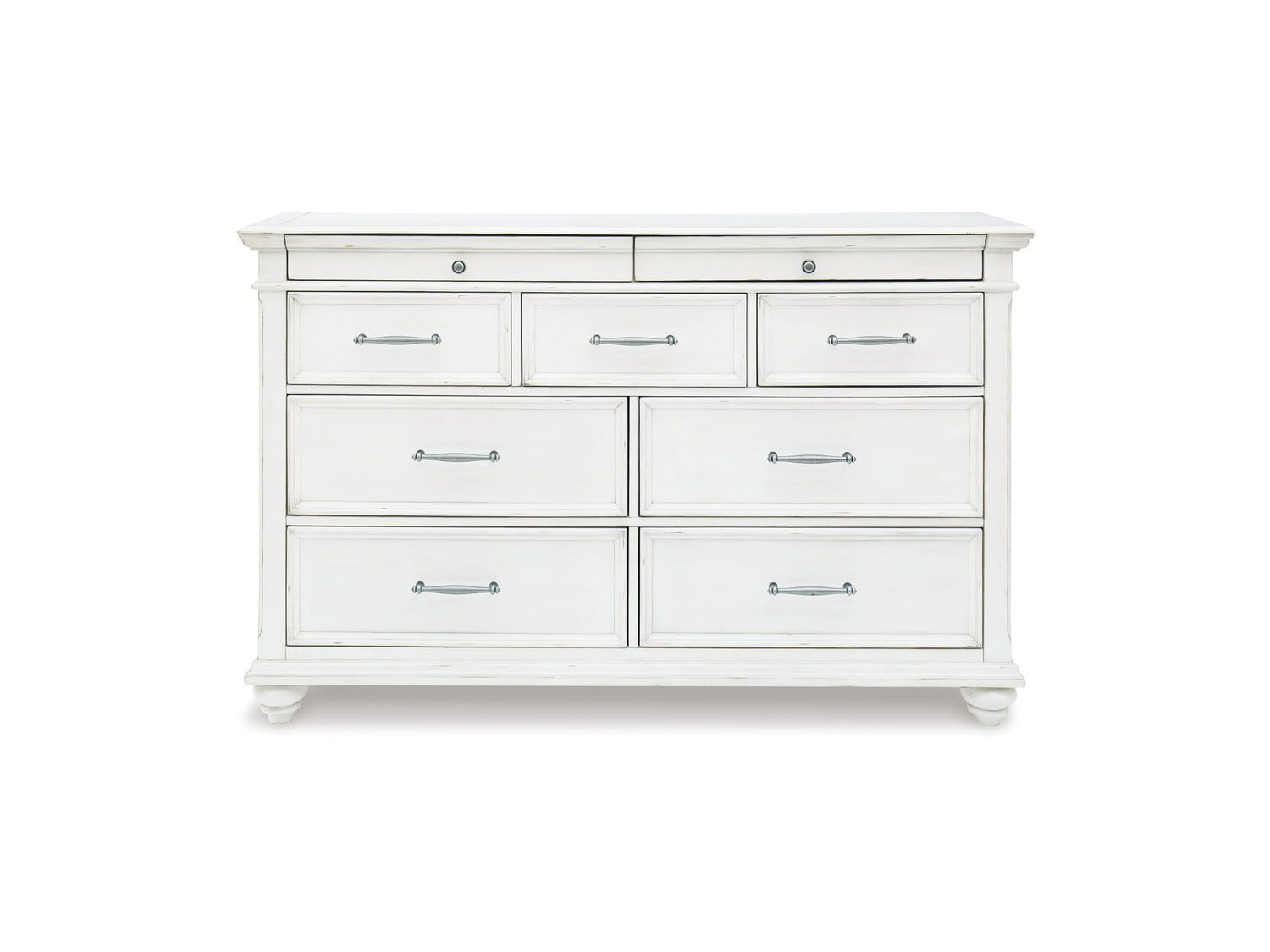 Series Features: Made with veneers and select hardwood solids in a distressed whitewashed finish. Design features updated traditional styling with generously scaled moulding details. Dresser features 7 full sized drawers with 2 small scaled accessory drawers. Ball-bearing side glides. Hardware has a transitional aesthetic and is finished in a dark gray pewter color. Mansion style headboard options feature a picture framed panel or inset tufted taupe upholstery cushion. Optional storage bench footboard.