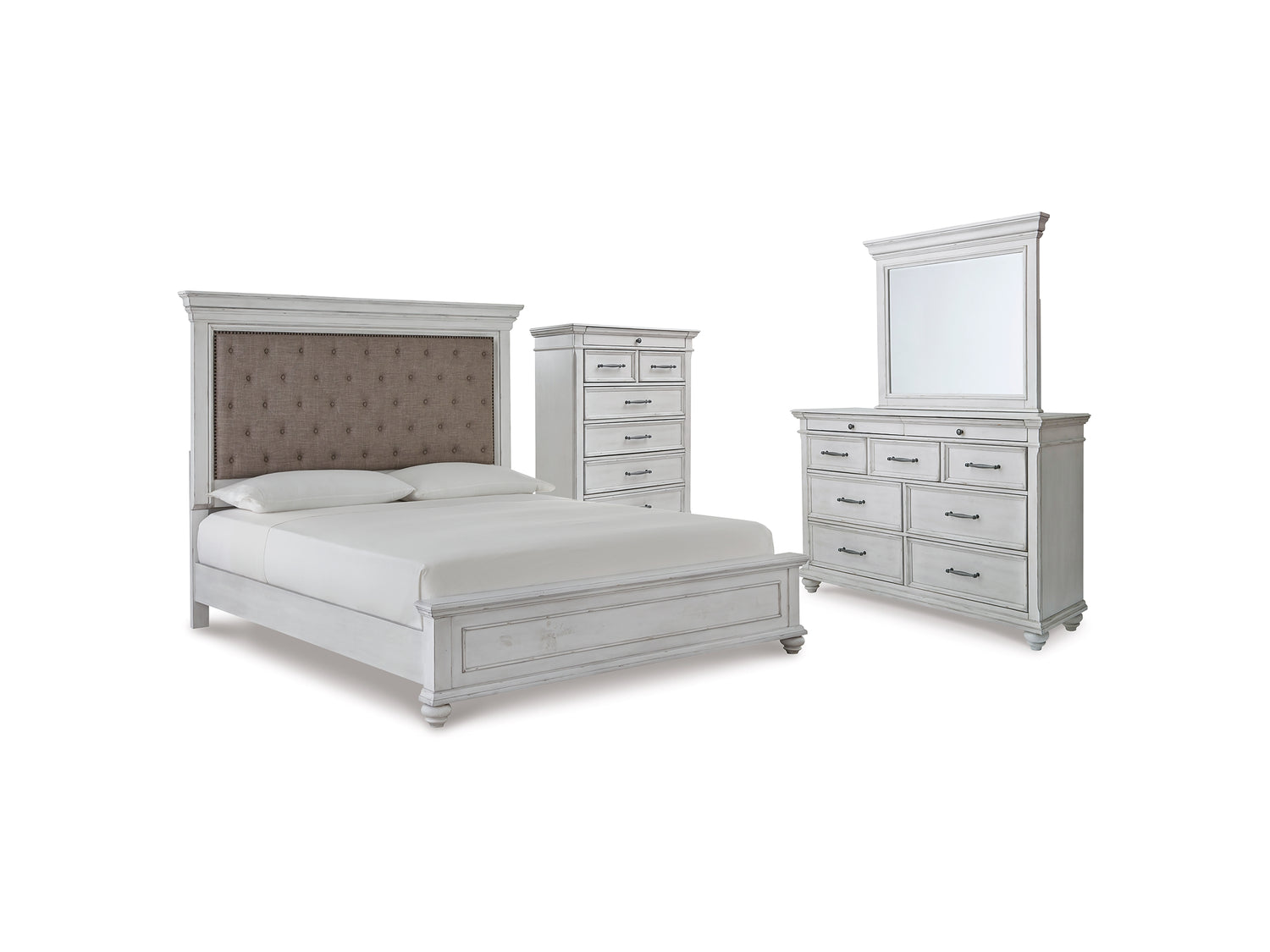 Item Name: Kanwyn King Upholstered Panel Bed, Dresser, Mirror and Chest
