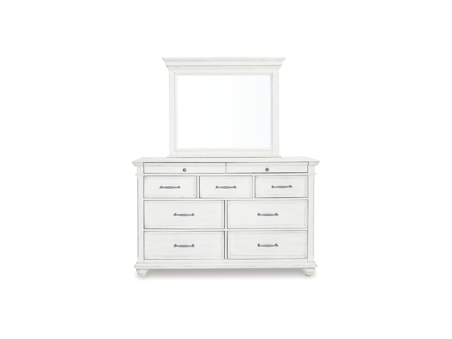 Series Features: Made with veneers and select hardwood solids in a distressed whitewashed finish. Design features updated traditional styling with generously scaled moulding details. Dresser features 7 full sized drawers with 2 small scaled accessory drawers. Ball-bearing side glides. Hardware has a transitional aesthetic and is finished in a dark gray pewter color. Mansion style headboard options feature a picture framed panel or inset tufted taupe upholstery cushion. Optional storage bench footboard.