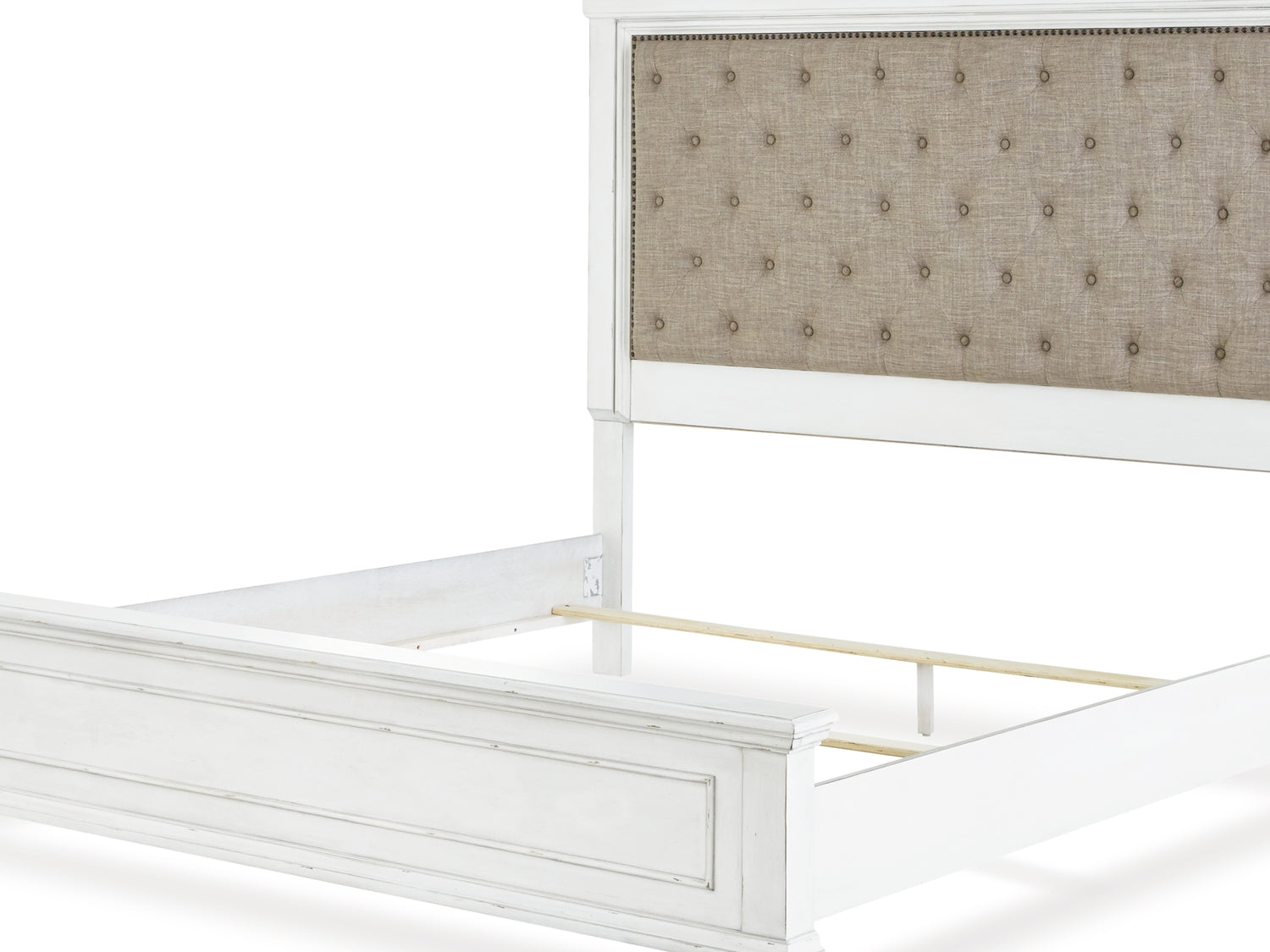 Series Features: Made with veneers and select hardwood solids in a distressed whitewashed finish. Design features updated traditional styling with generously scaled moulding details. Dresser features 7 full sized drawers with 2 small scaled accessory drawers. Ball-bearing side glides. Hardware has a transitional aesthetic and is finished in a dark gray pewter color. Mansion style headboard options feature a picture framed panel or inset tufted taupe upholstery cushion. Optional storage bench footboard.