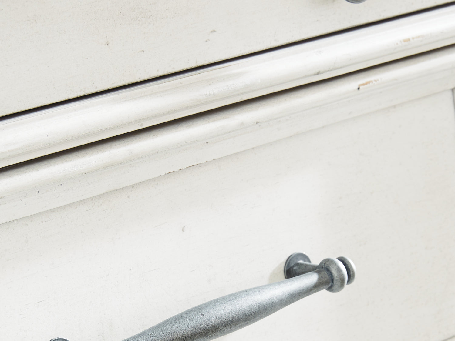 Series Features: Made with veneers and select hardwood solids in a distressed whitewashed finish. Design features updated traditional styling with generously scaled moulding details. Dresser features 7 full sized drawers with 2 small scaled accessory drawers. Ball-bearing side glides. Hardware has a transitional aesthetic and is finished in a dark gray pewter color. Mansion style headboard options feature a picture framed panel or inset tufted taupe upholstery cushion. Optional storage bench footboard.