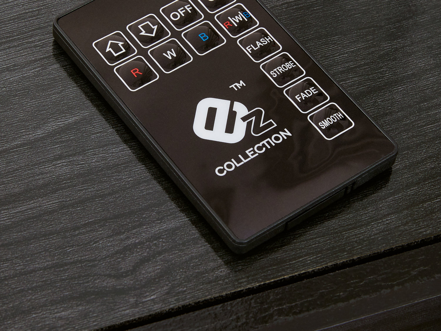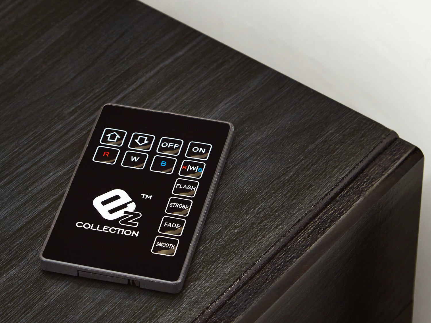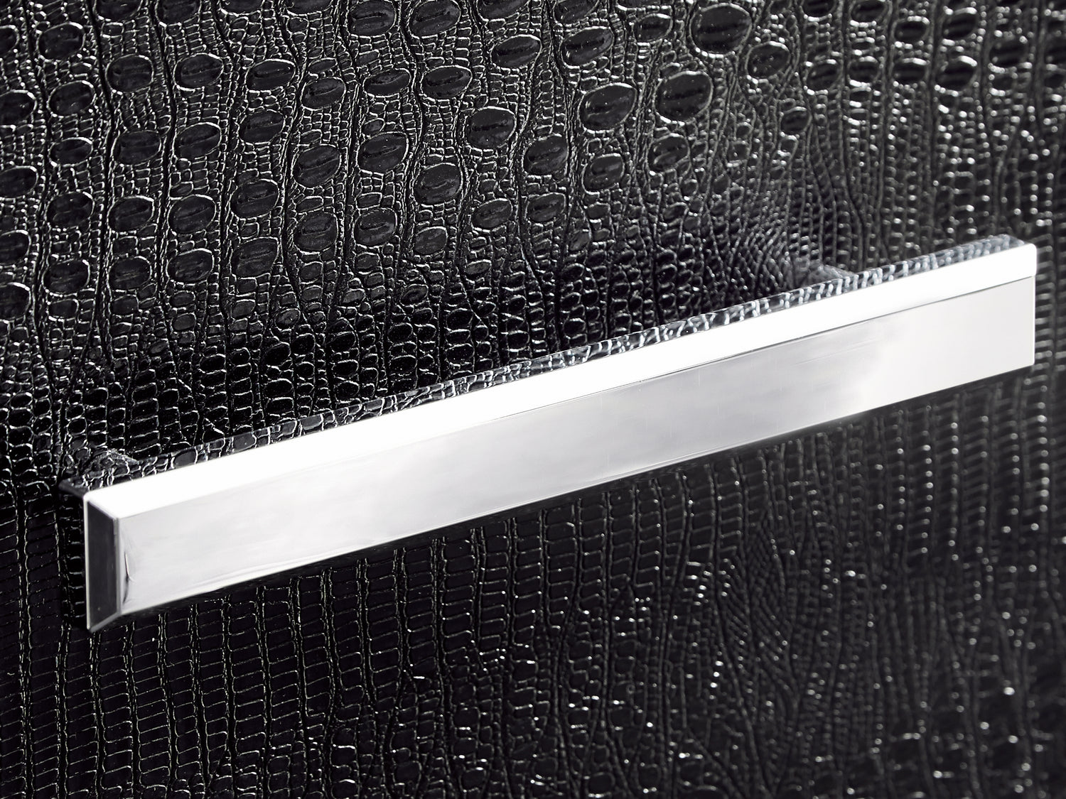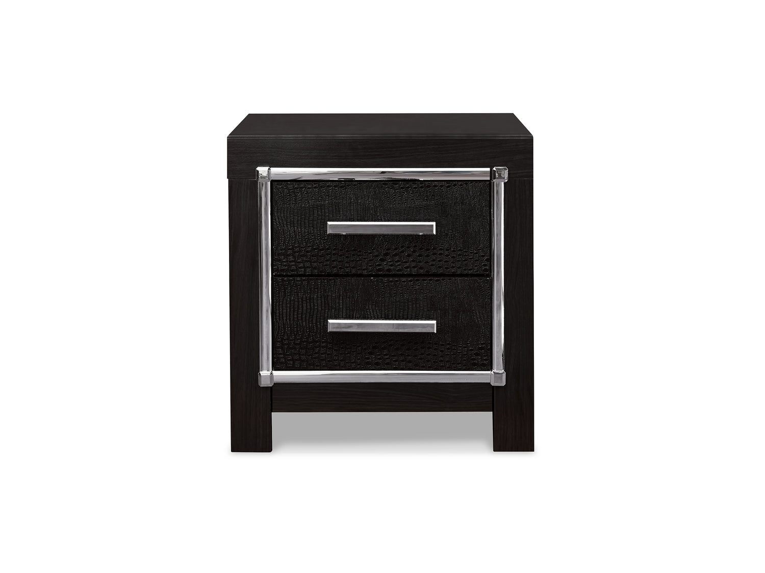 Series Features: Textured faux black gator finish on case fronts, with replicated Walnut wood grain sides. Cases and bed are accented with faceted chrome details. Large scaled chrome handle with faceted details. Headboards are accented with LED lighting and include a remote for color and brightness options. Included remote holder discreetly keeps light remote accessible. Headboards are accented with faux crystal tufted black upholstery. Side roller glides for smooth operating drawers. Drawer interiors are lined with a faux linen laminate for a clean finished look. Both king and queen panel beds have a panel footboard (54,56) and storage footboard option (54S,56S). Queen (57) and king (58) headboards can attach to a bolt-on metal bed B100-31 or B100-66 respectively. Queen (57) upholstered panel headboard is capable of attaching a full sized metal bolt on bed frame. Queen, king/cal king (157,158) upholstered panel headboards feature glitter details accented with LED lighting and include a remote for color and brightness options. Queen (157) and king (158) headboards are compatible with all footboards (54,56,54S,56S) or can attach to a bolt-on metal bed B100-31 or B100-66 respectively. Both USB and wireless charging options are provided with the night stand. Safety is a top priority, clothing storage units are designed to meet the most current standard for stability, ASTM F 2057 (ASTM International). Drawers extend out to accommodate maximum access to drawer interior while maintaining safety.
